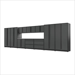 Proslat Garage Cabinets 12-Piece Glossy Grey Cabinet Set with Black Handles and Stainless Steel Worktop