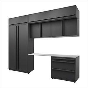 Proslat Garage Cabinets 7-Piece Mat Black Cabinet Set with Black Handles and Stainless Steel Worktop