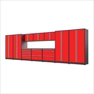Proslat Garage Cabinets 12-Piece Glossy Red Cabinet Set with Silver Handles and Stainless Steel Worktop