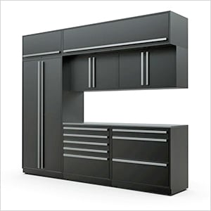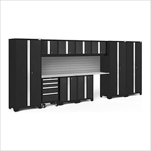 Proslat Garage Cabinets 8-Piece Mat Black Cabinet Set with Silver Handles and Stainless Steel Worktop