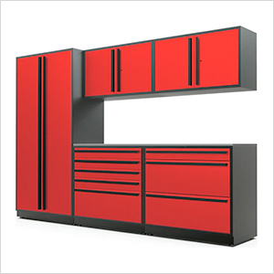 Proslat Garage Cabinets 9-Piece Glossy Red Cabinet Set with Black Handles and Powder Coated Worktop