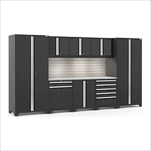 NewAge Garage Cabinets PRO Series Black 9-Piece Set with Stainless Steel Top, Slatwall and LED Lights