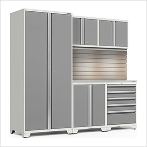 NewAge Garage Cabinets PRO Series Platinum 6-Piece Set with Stainless Steel Top, Slatwall and Lights