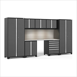 NewAge Garage Cabinets PRO Series Grey 8-Piece Set with Stainless Steel Top, Slatwall and LED Lights