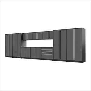Proslat Garage Cabinets 12-Piece Glossy Grey Cabinet Set with Silver Handles and Stainless Steel Worktop