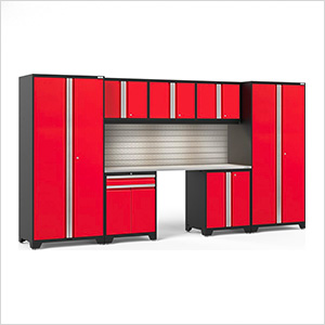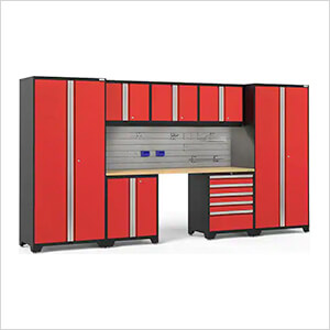 NewAge Garage Cabinets PRO Series Red 8-Piece Set with Stainless Steel Top, Slatwall and LED Lights