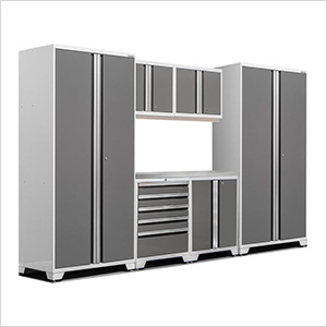NewAge Garage Cabinets PRO Series Platinum 7-Piece Set with Stainless Steel Top and LED Lights