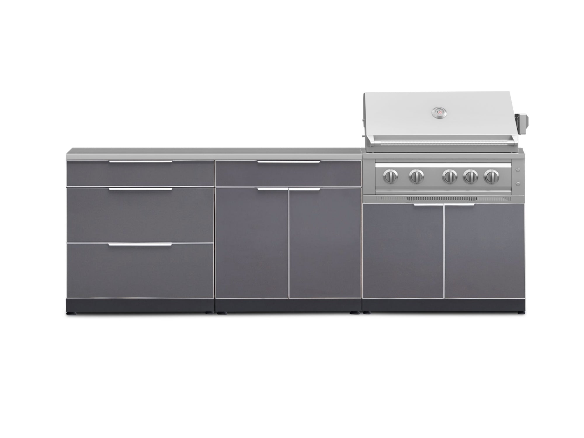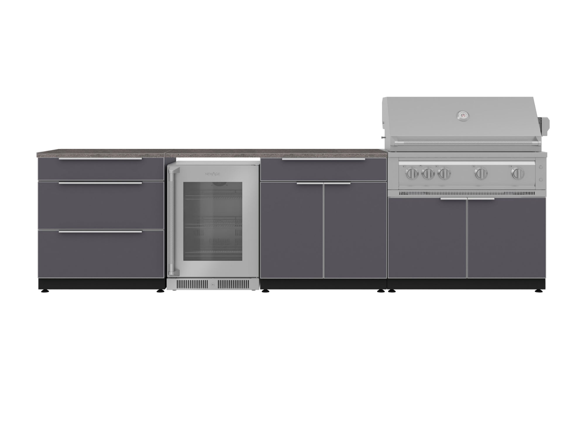 NewAge Outdoor Kitchens Aluminum 5-Piece Cabinet Set With 3 Drawer, Bar, Grill Cabinet, Platinum Grill and Countertop