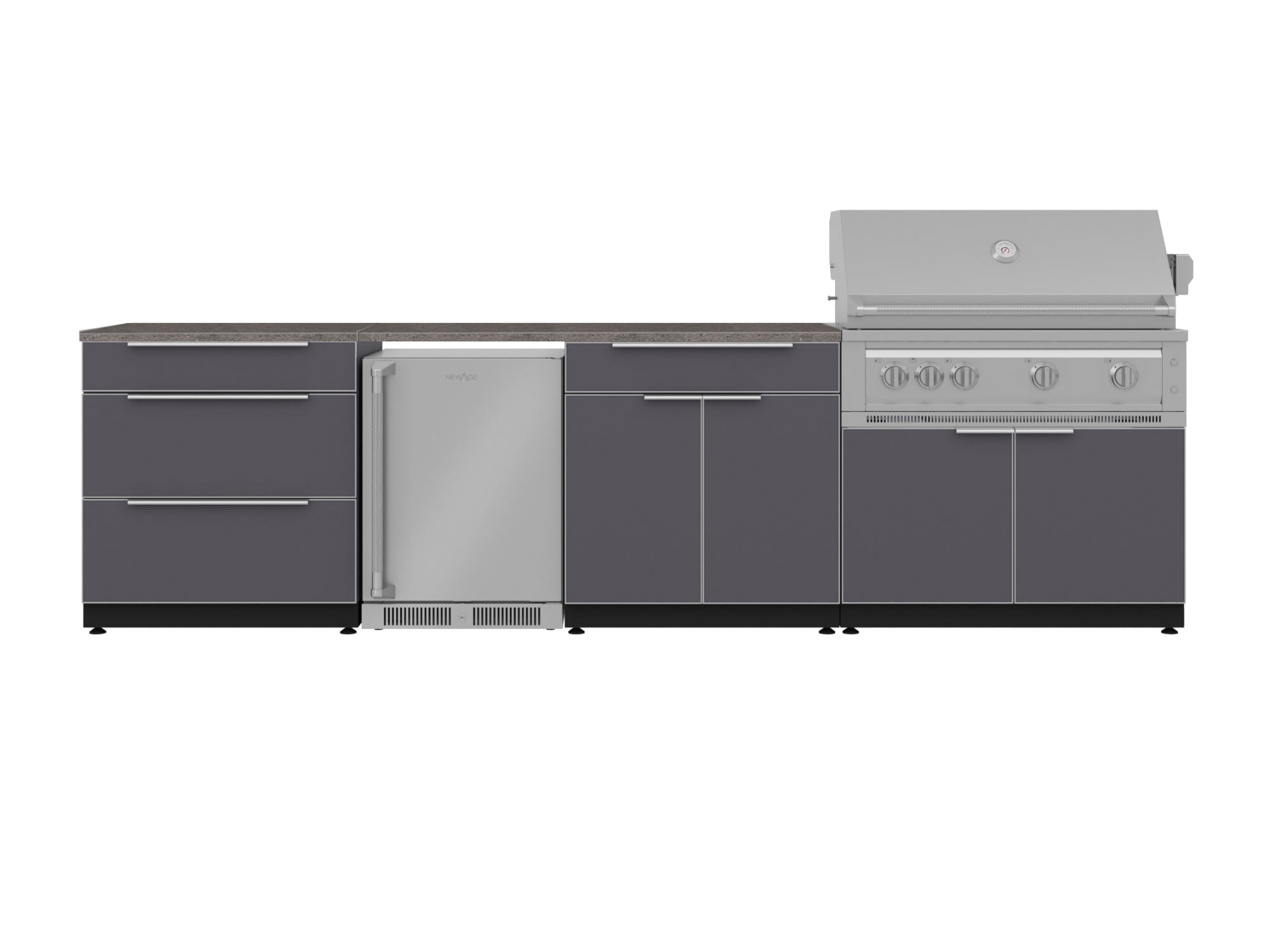 NewAge Outdoor Kitchens Aluminum 7-Piece Cabinet Set with 3-Drawer, Bar, Grill Cabinet, Platinum Grill, Countertops and Fridge
