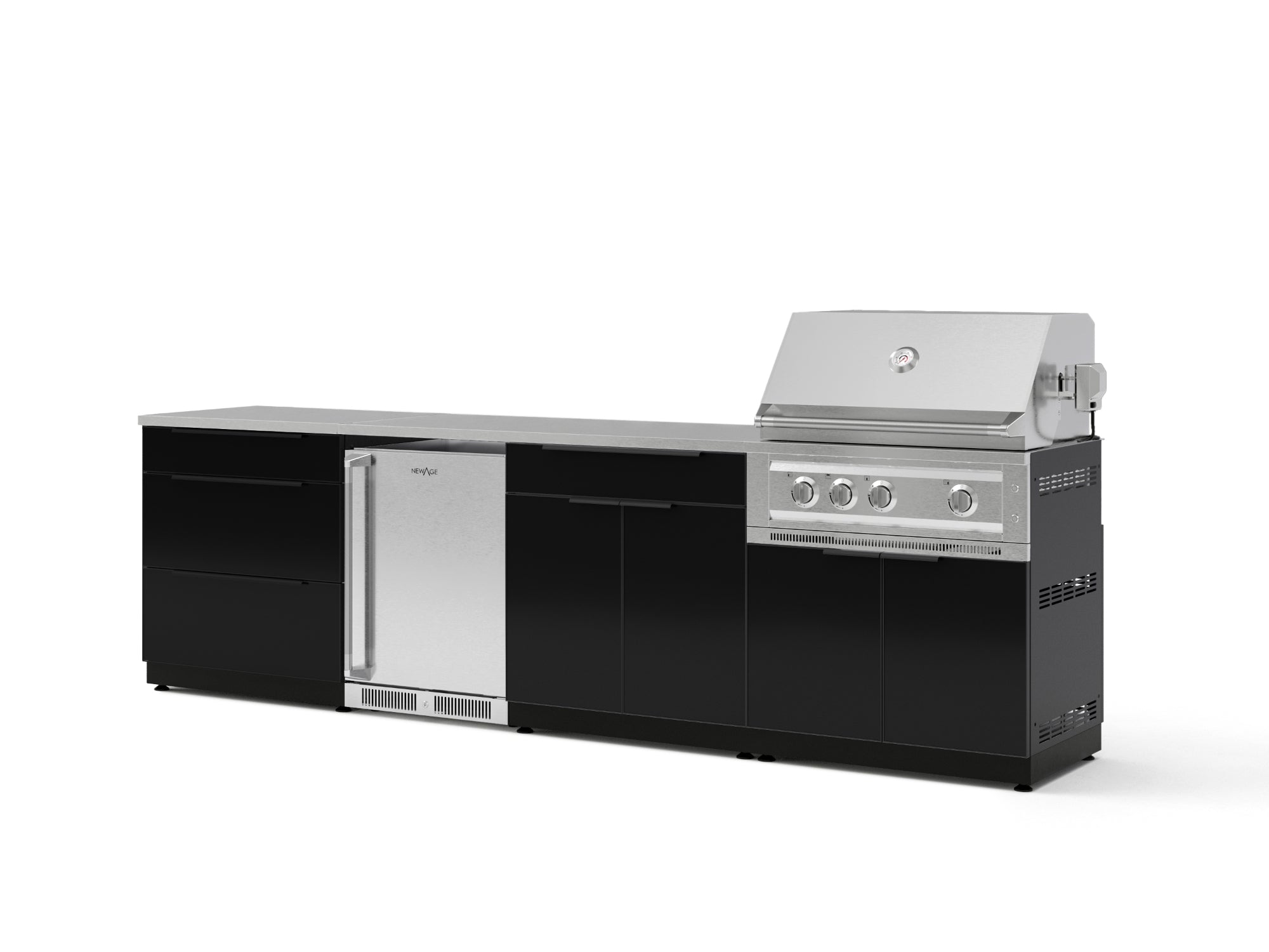 NewAge Outdoor Kitchens Aluminum 7-Piece Cabinet Set with 3-Drawer, Bar, Grill Cabinet, Platinum Grill, Countertops and Stainless Steel Door Fridge