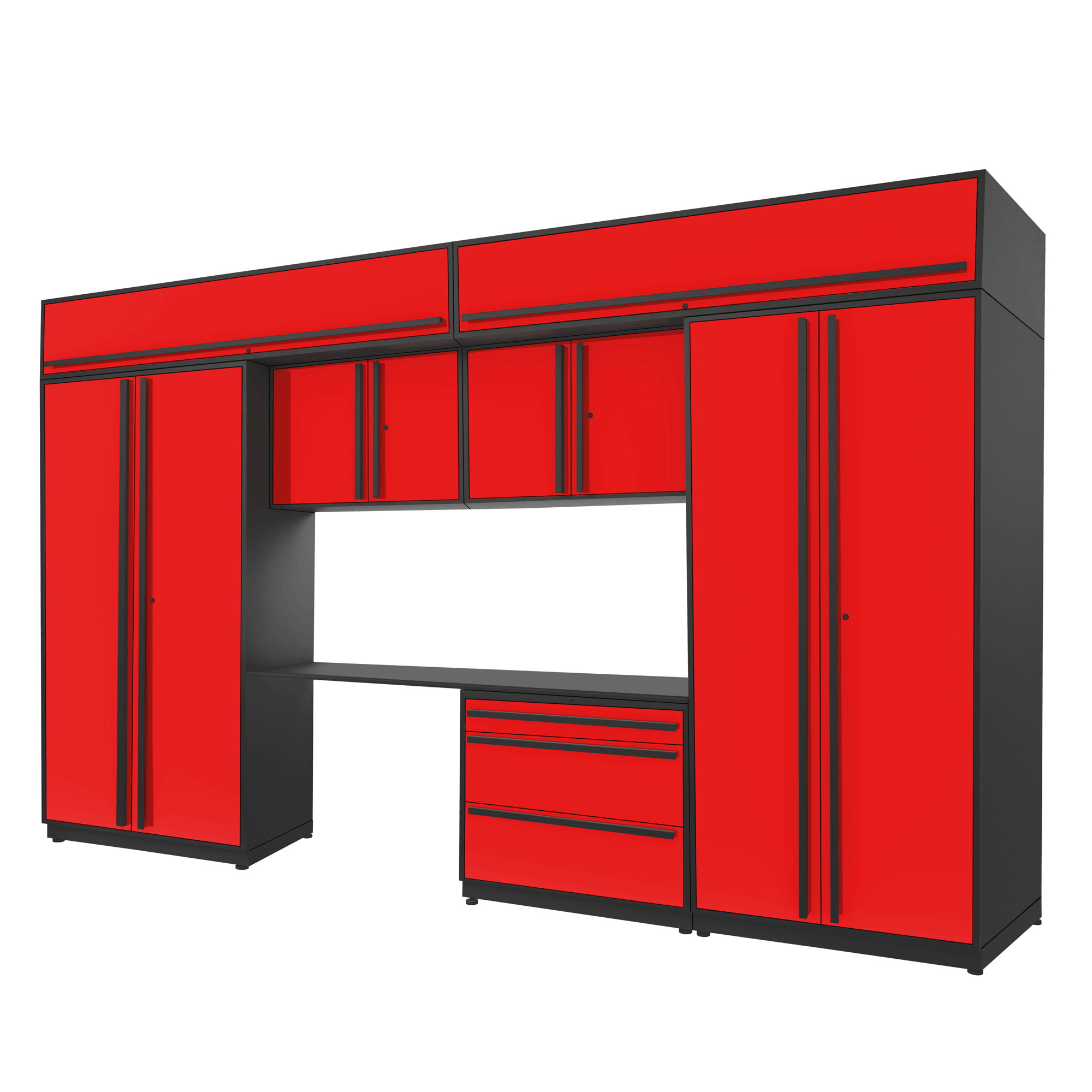 Newage Products Pro 3.0 Series 8-Piece Garage Cabinet Set With 2X 5-Drawer Tool Cabinets, Red / Stainless Steel Worktop / LED Lights + Slatwall Backsplash