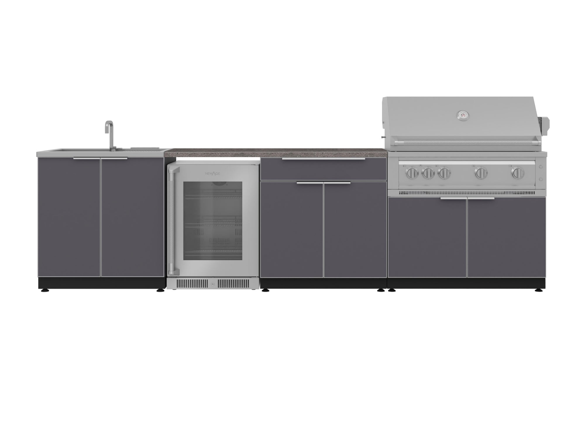 NewAge Outdoor Kitchens Aluminum 6-Piece Cabinet Set with Sink, Bar, Grill Cabinet, Platinum Grill, Countertop and Fridge