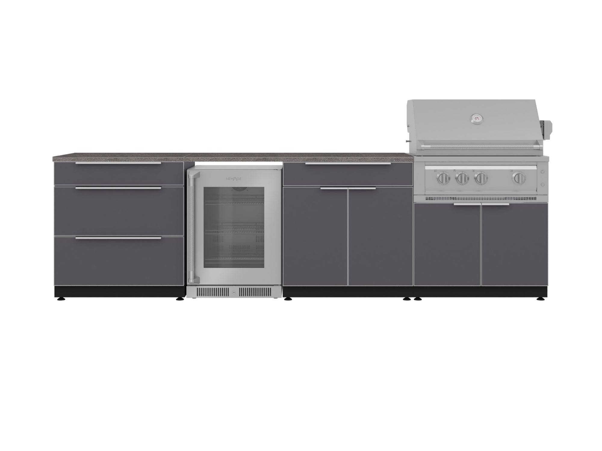 NewAge Outdoor Kitchens Aluminum 7-Piece Cabinet Set with 3-Drawer, Bar, Grill Cabinet, Performance Grill, Countertops and Glass Door Fridge