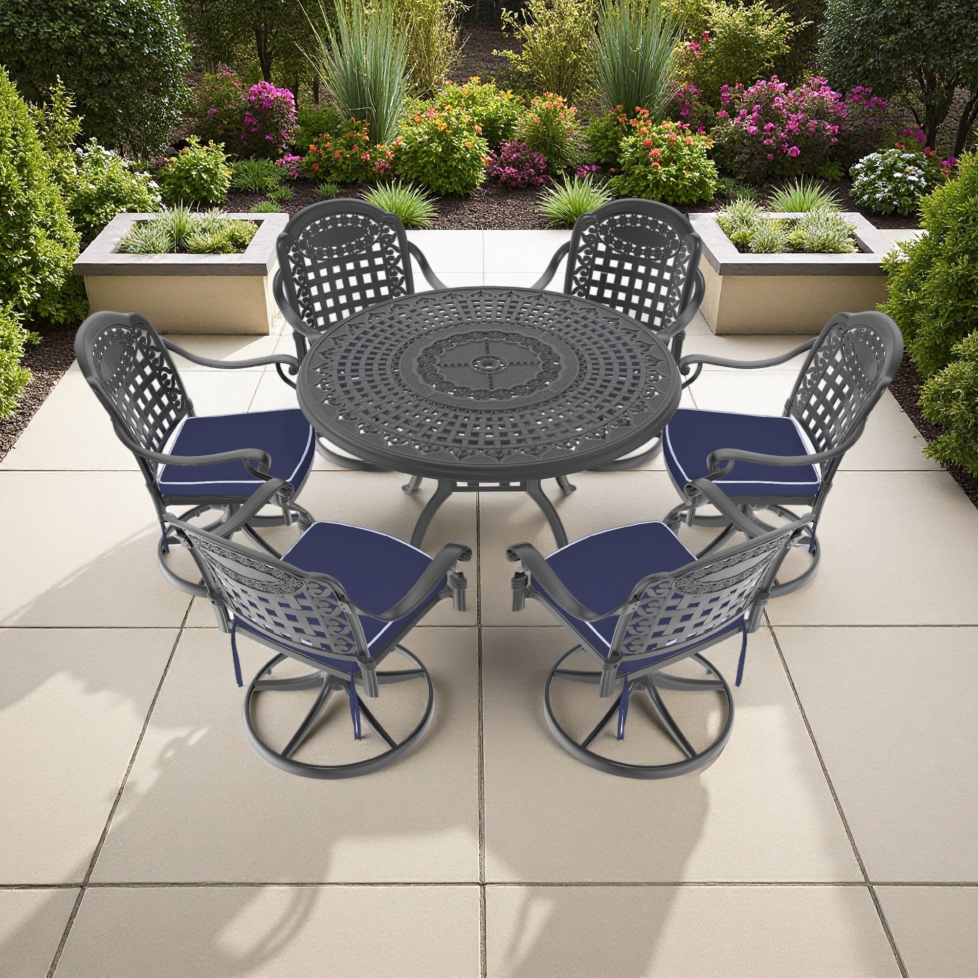 7-Piece Outdoor Aluminum Dining Set with Round Table, Umbrella Hole and 6 Swivel Chairs