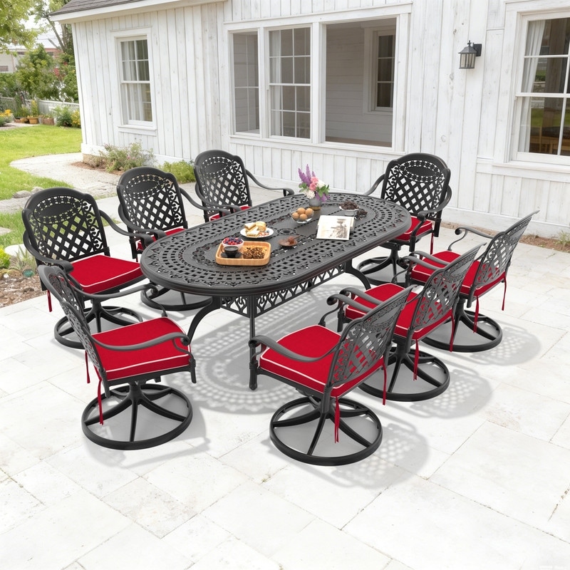 81.89in Oval Cast Aluminum Outdoor Dining Table and 8 Swivel Black Frame Outdoor Chairs with Brown Cushions