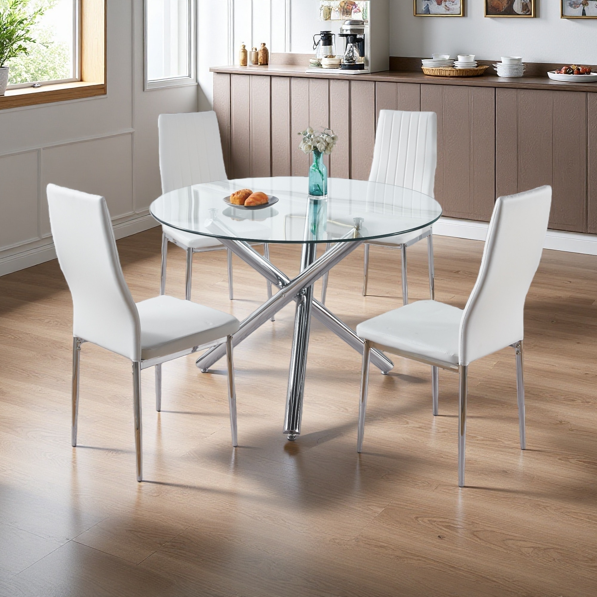 Set of 5 Dining Set, Metal Pedestal Leg Mid-Century Dining Table with Glass Table Top, End Table, Leisure Coffee Table