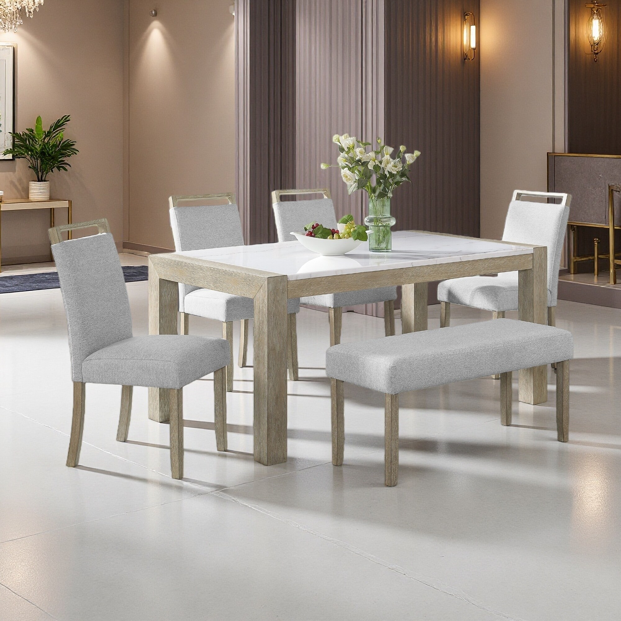 6pc Wood Grain Dining Table Set with 4 Button Tufted Dining Chairs and Bench Rectangular Kitchen Dining Table Dining Set for 6