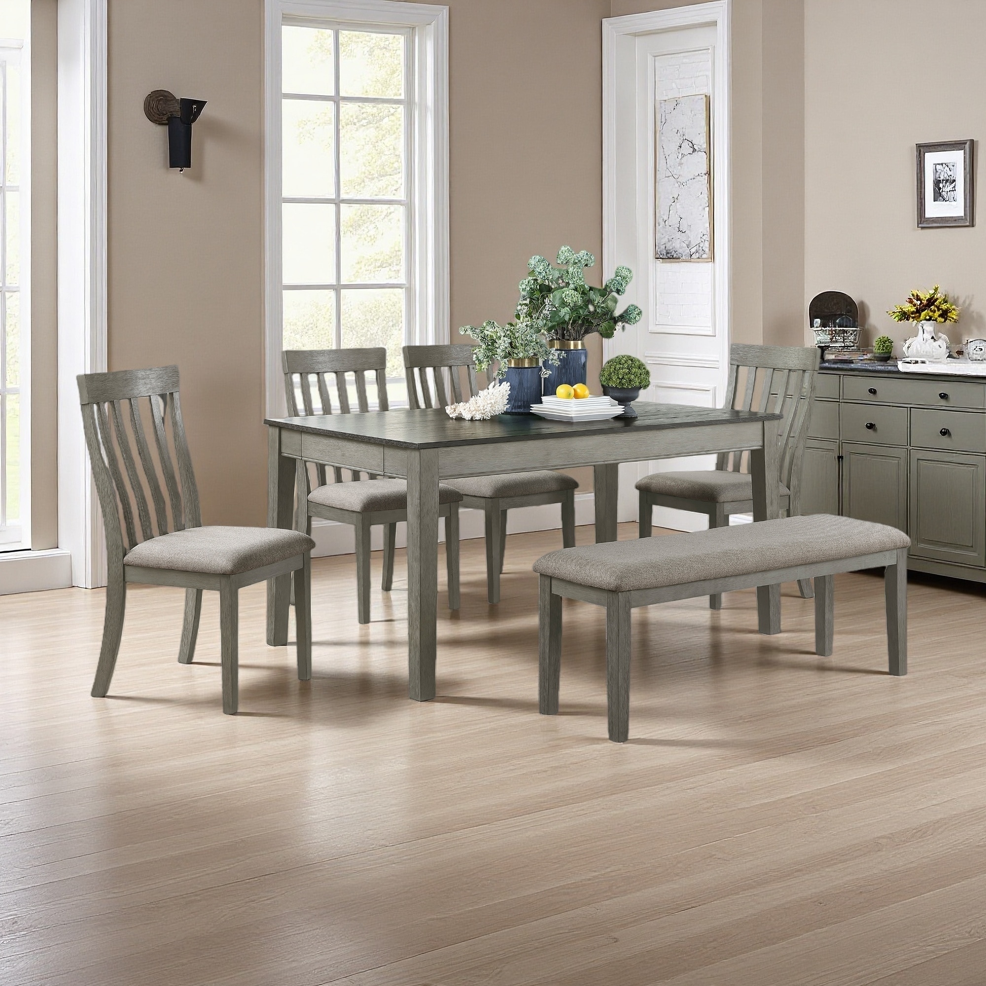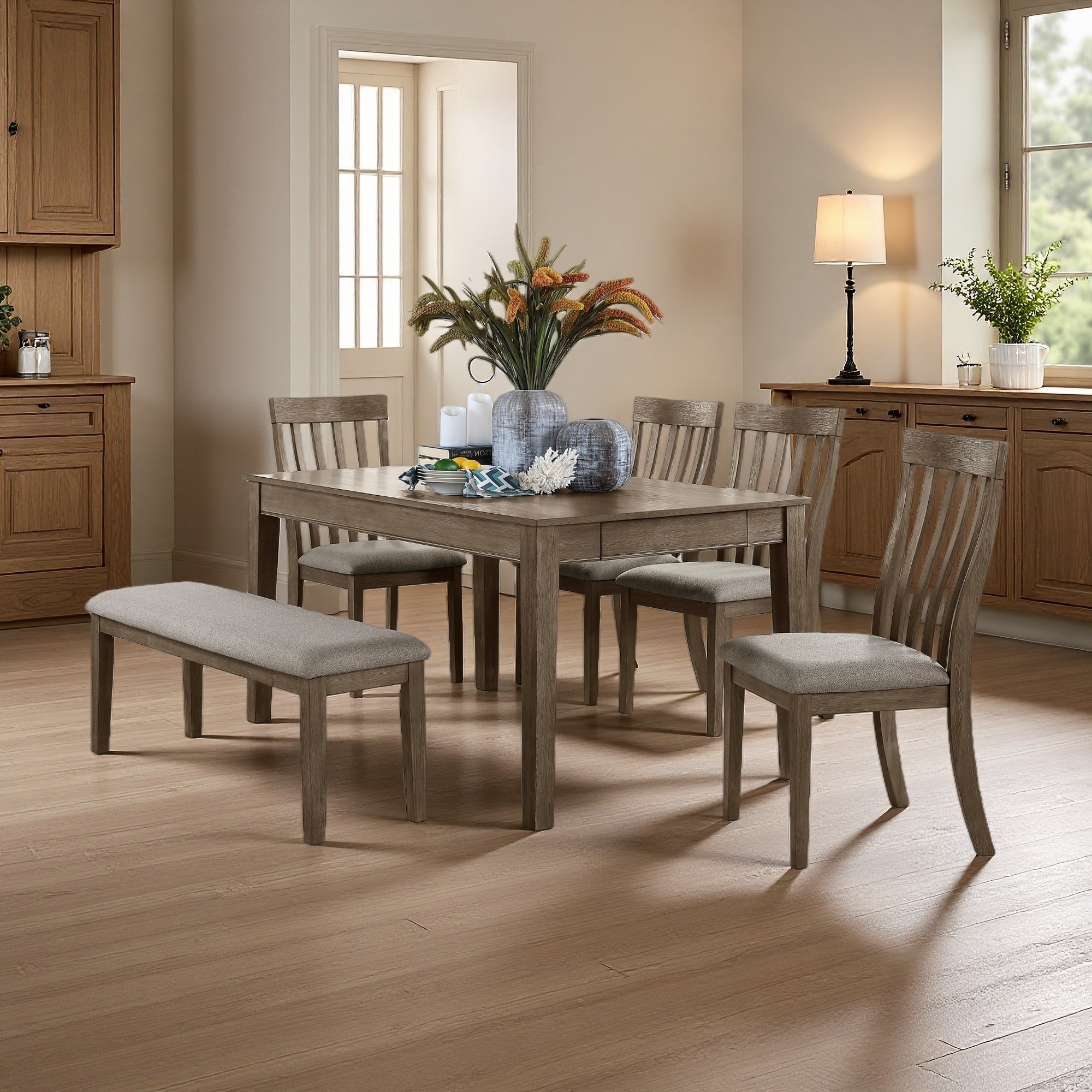 Set of 6 Casual Dining Table 36" x 60" with 2 Drawers, Wire Brushed Finish, 1 Bench, 4x Side Chairs, Fabric Upholstered Seats