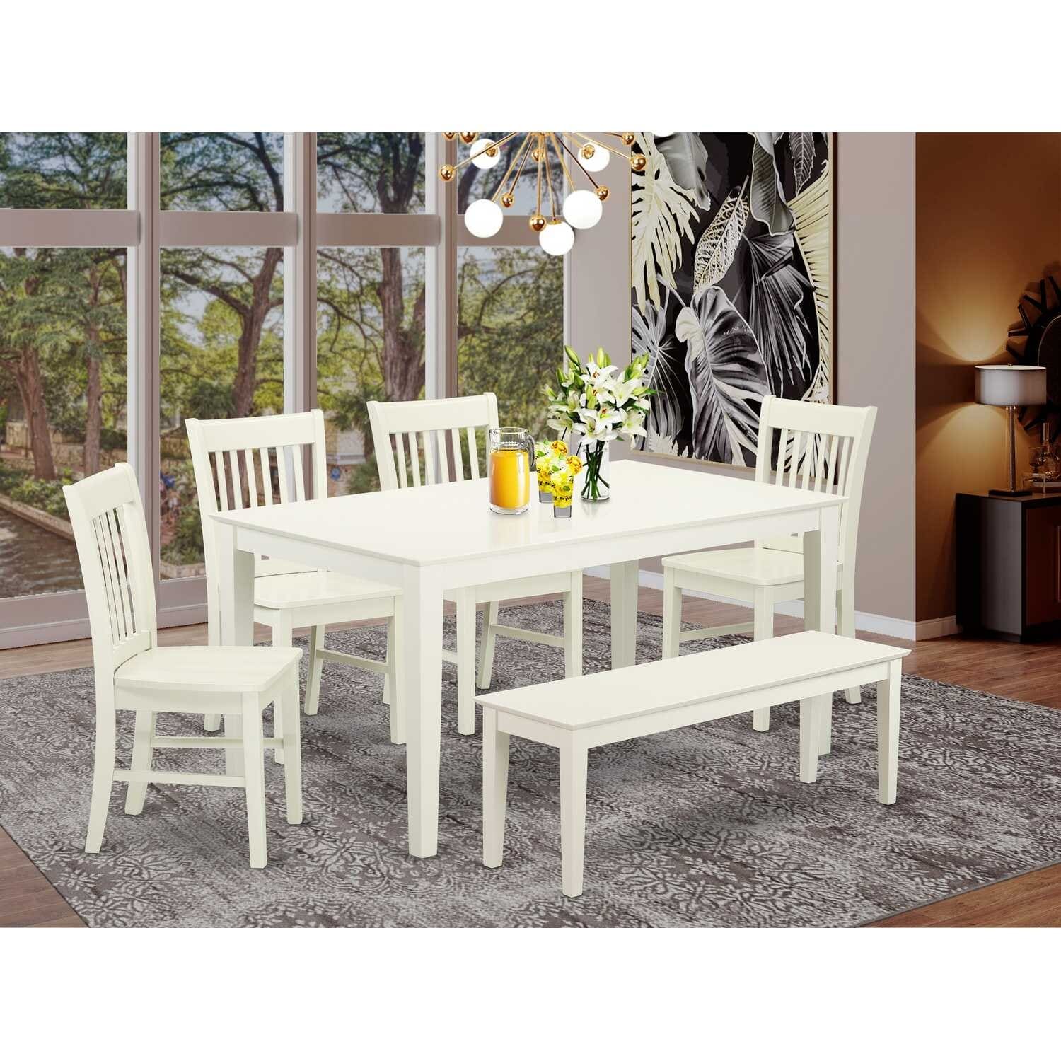 HomeStock 6-Piece Rectangle Linen White Finish Solid Wood Top Dining Table with 1 Bench, 4 Chairs