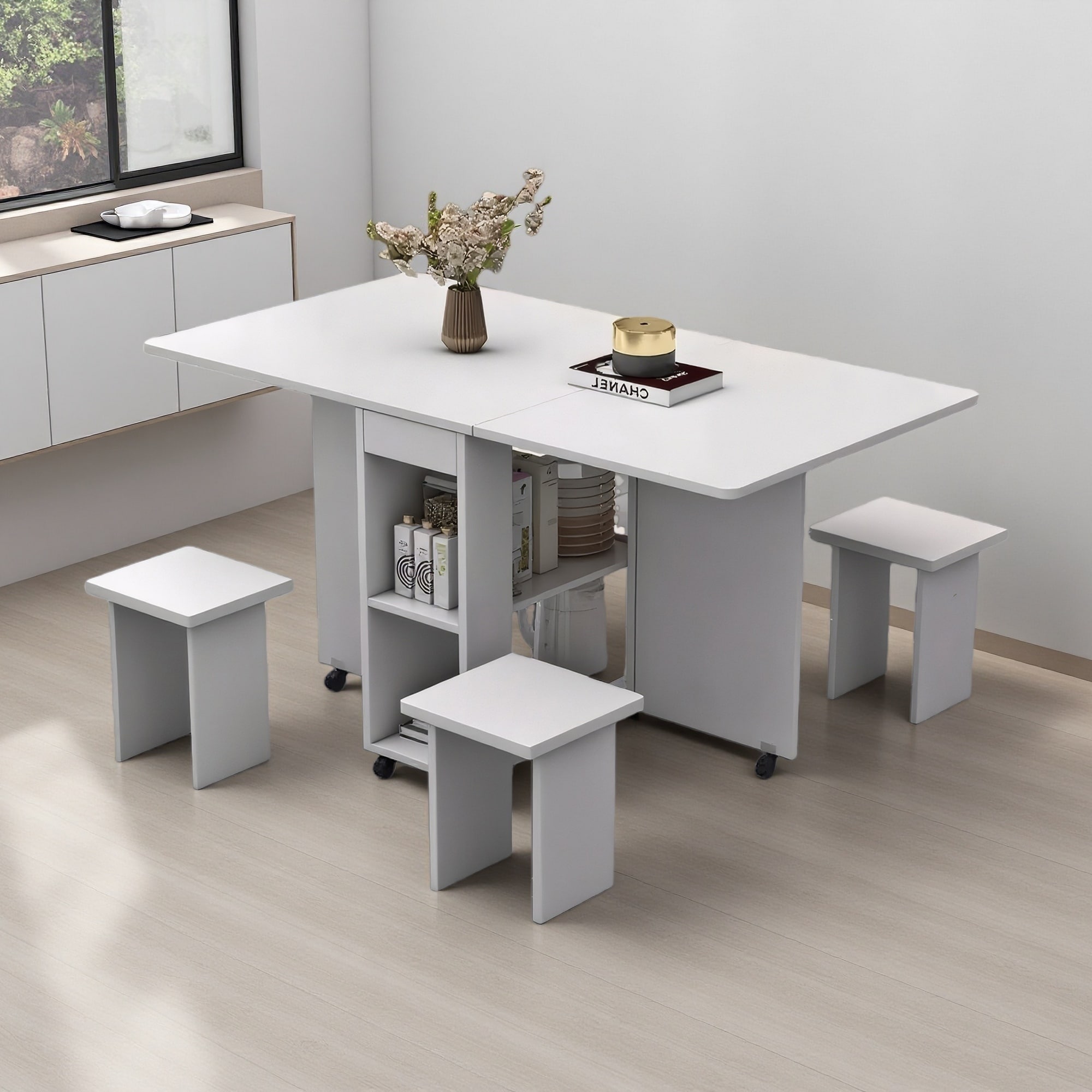 Set of 5 MDF 47.2" Folding Drop Leaf Dining Table Set with 4 Chairs, Space-Saving Design, Storage, and 6 Wheels - Flexible Use