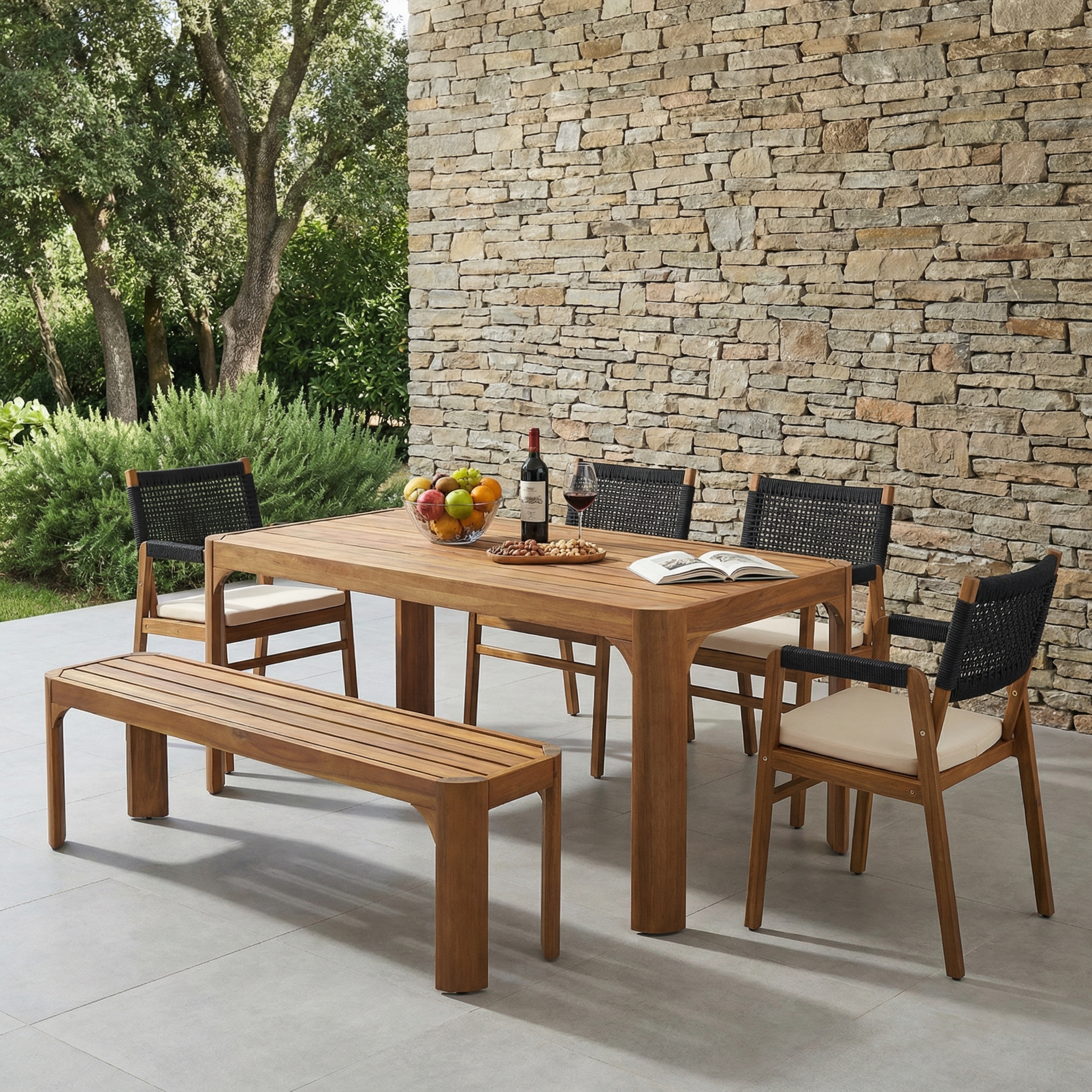 Christopher Knight Home - Outdoor Acacia Wood 6-Piece Dining Table Set with Woven Back Chairs, Bench and Slatted Rectangle Table