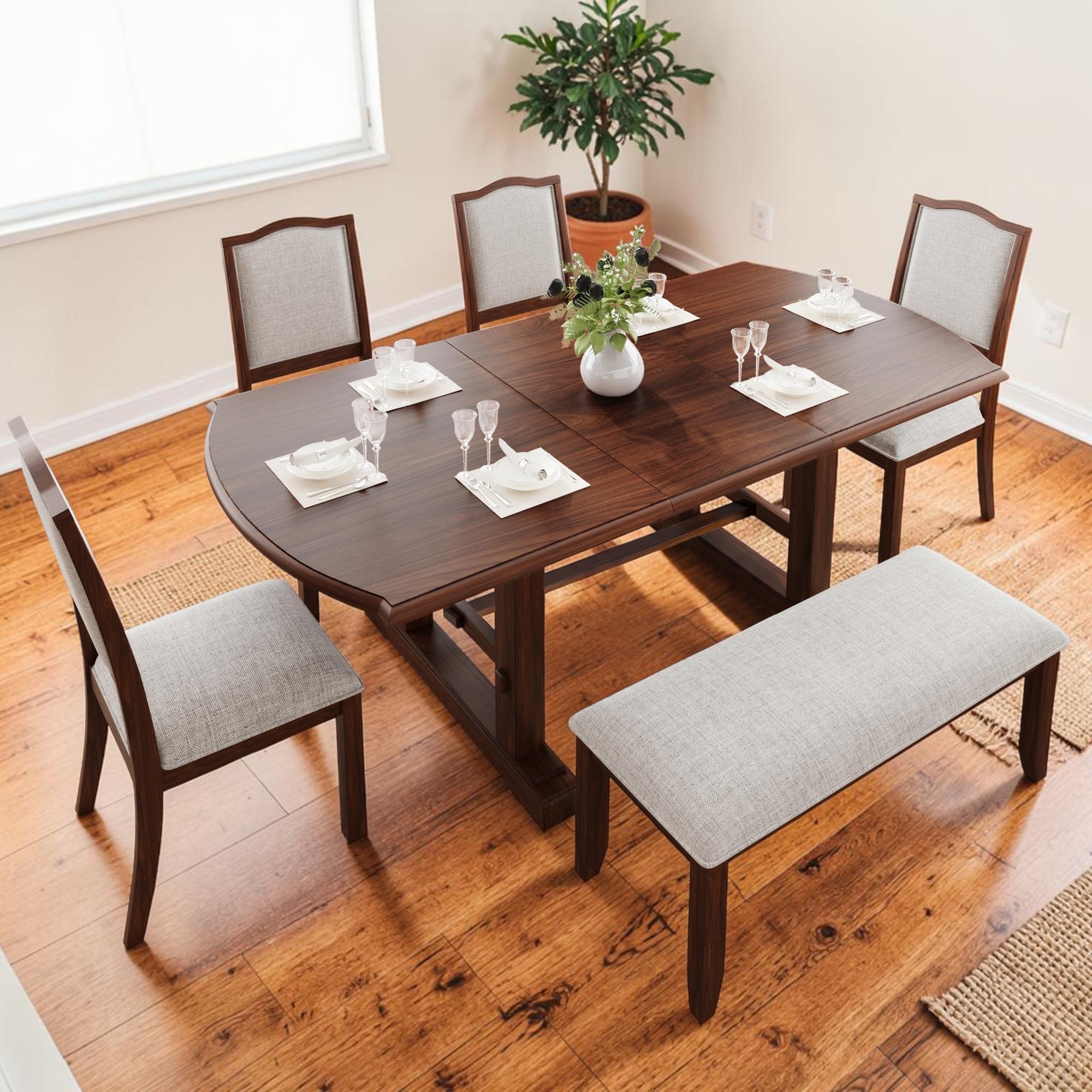 Extendable 6-Piece Dining Set with 78" Wood Table, 4 Upholstered Chairs, and Bench, Seats 6-8 Guests