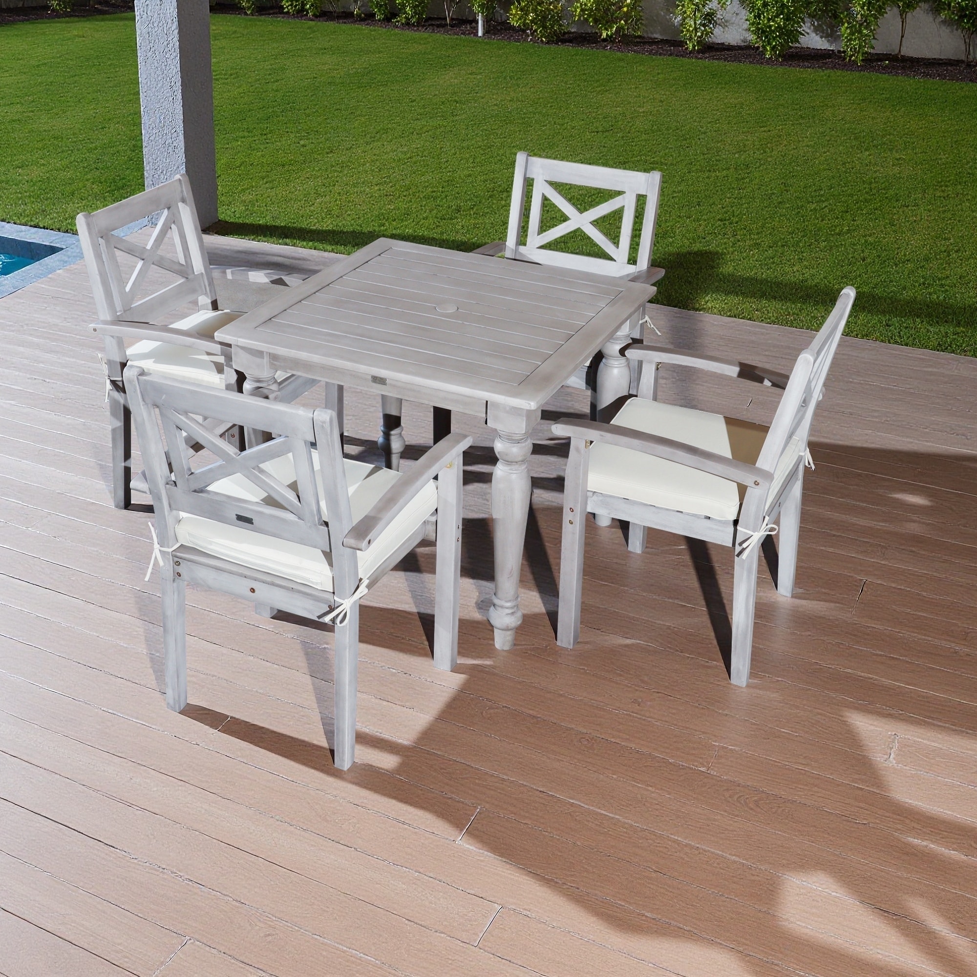 5-Piece Outdoor Eucalyptus Wood Dining Set with Square Table, Umbrella Hole and 4 Stackable Armchairs with Cushions