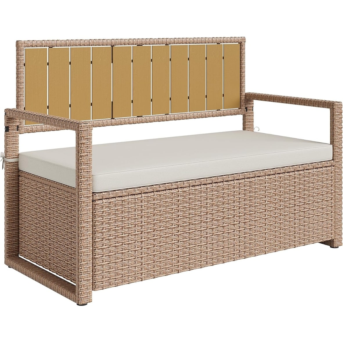 Outdoor Storage Bench with Cushion, Rattan 2-Seat Storage Bench with Backrest, Brown