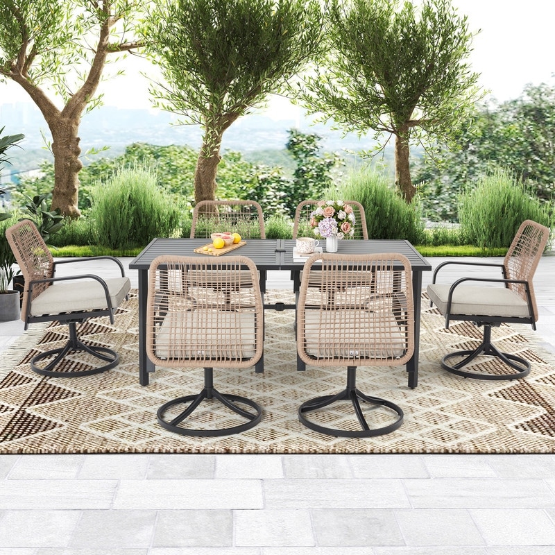 Erommy 7 Piece Outdoor Dining Set with Umbrella Hole, Patio Table and 6 Rattan Chairs with Cushions, Weather-Resistant Furniture