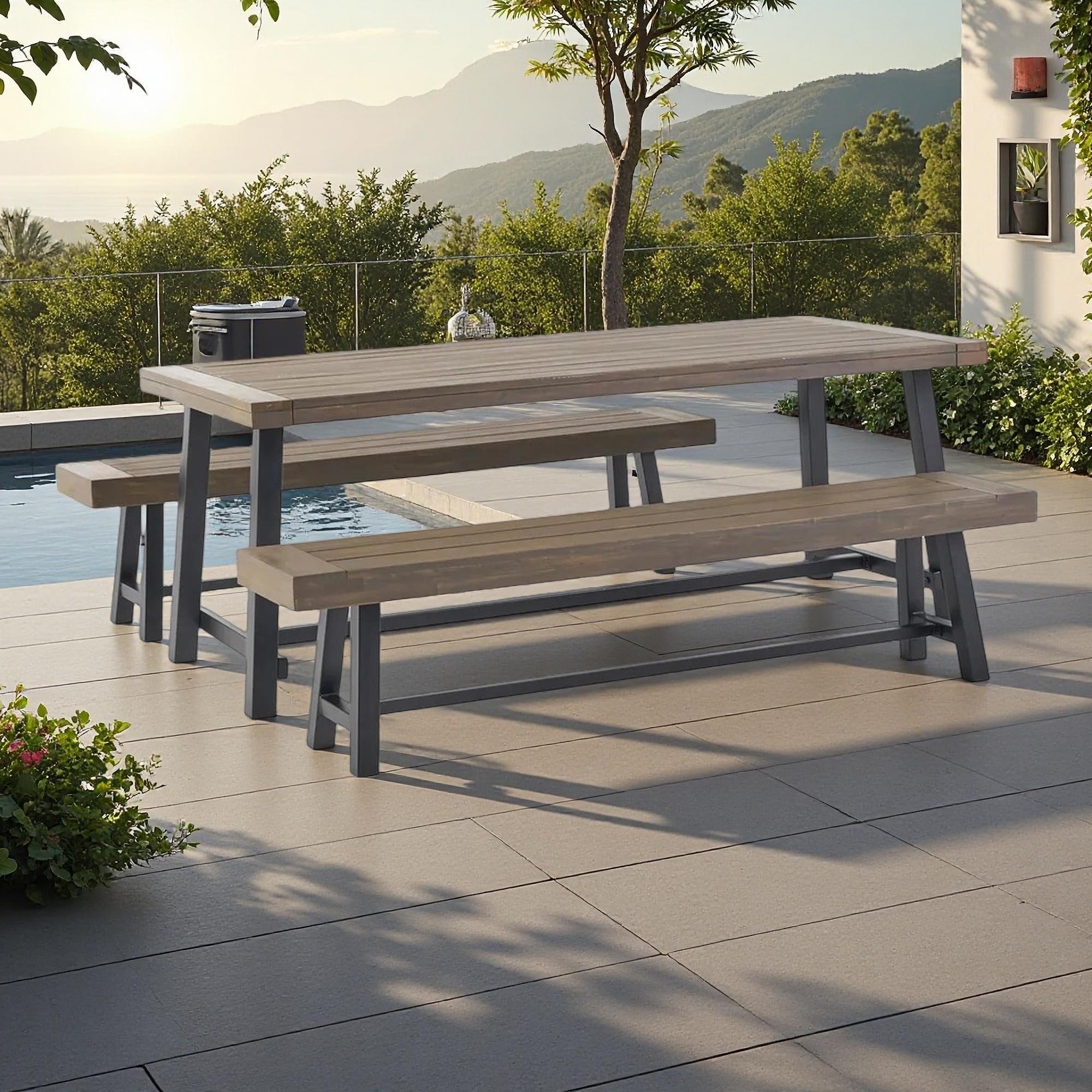 Rustic 3-Piece Outdoor Patio Picnic Dining Set with 2 Benches, Acacia Wood and Iron Frame