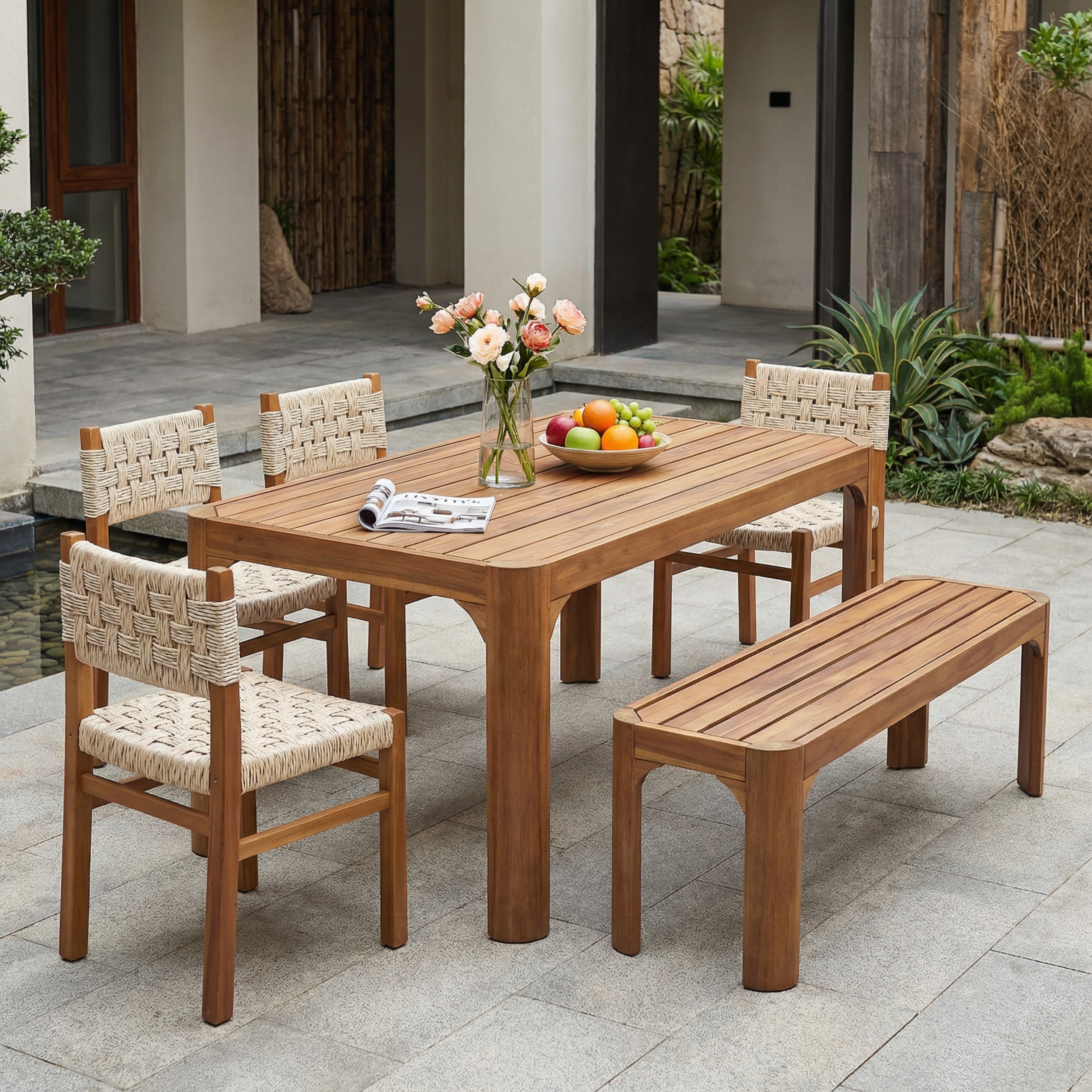 Christopher Knight Home - Outdoor Solid Acacia Wood 6-Piece Dining Set with Rope Woven Chairs, Bench and Slatted Rectangle Table