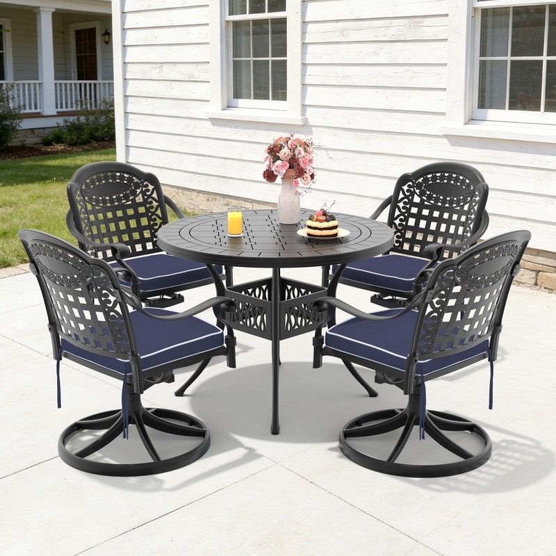 39.37in Round Black Cast Aluminum Outdoor Dining Table and 4 Swivel Black Frame Outdoor Chairs with Cushions