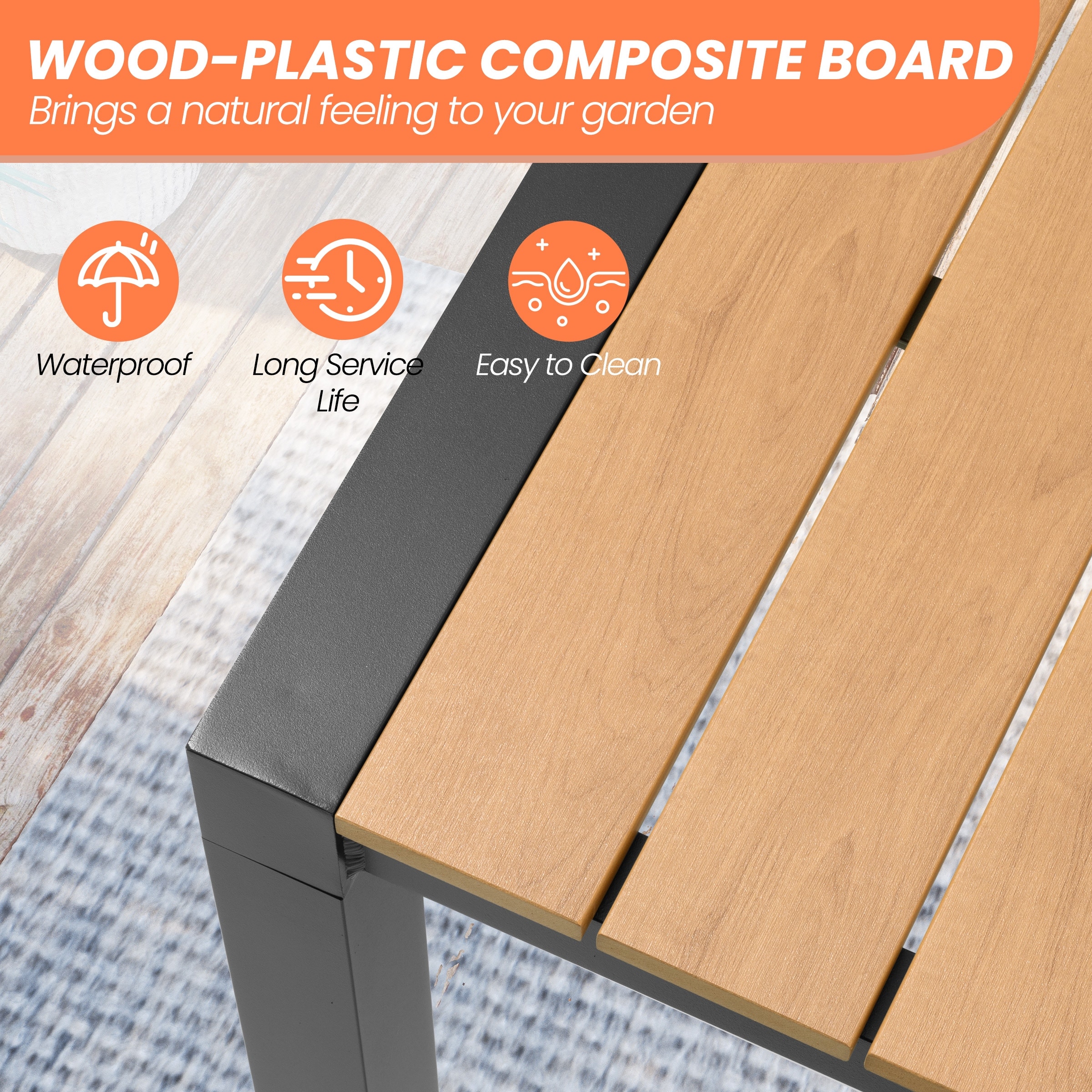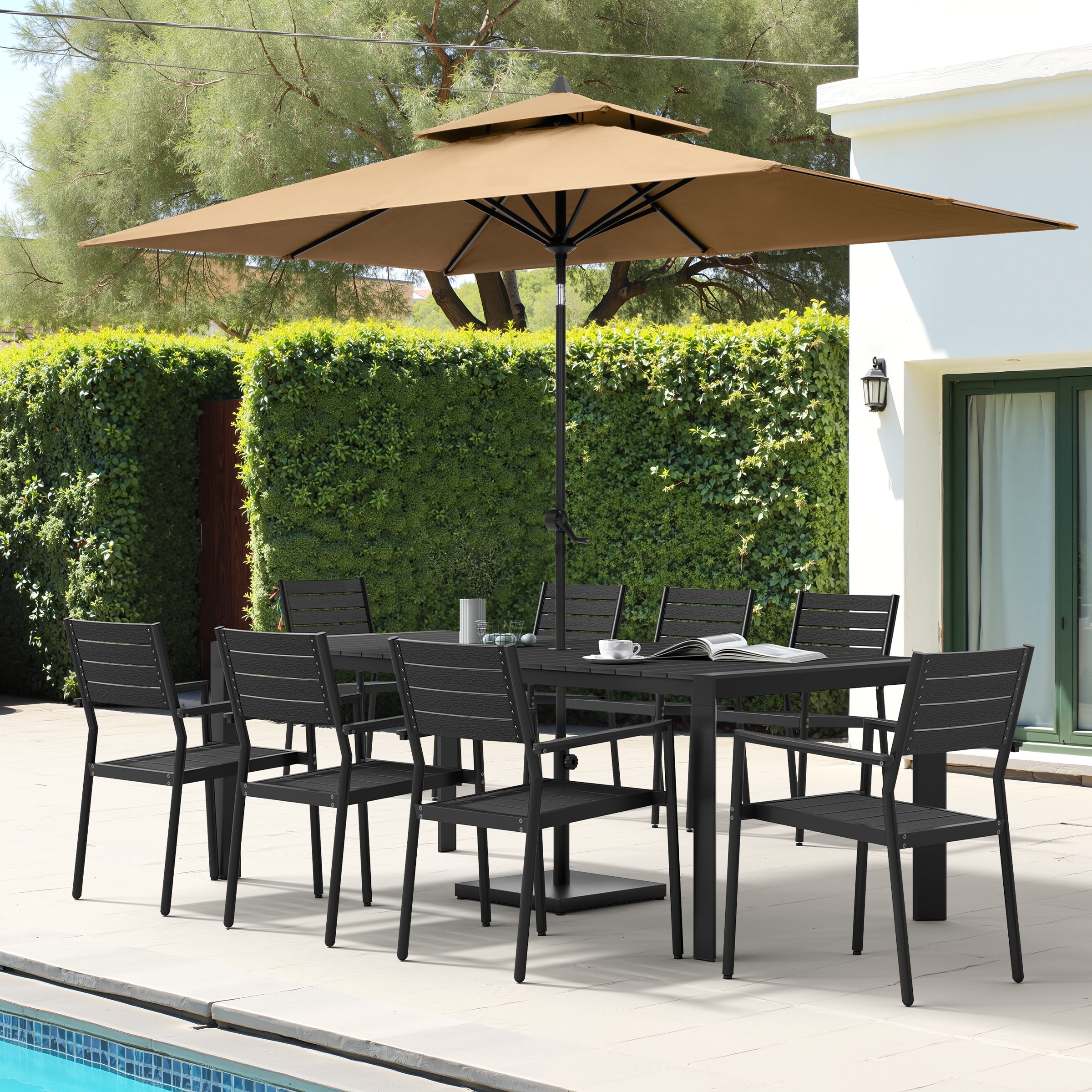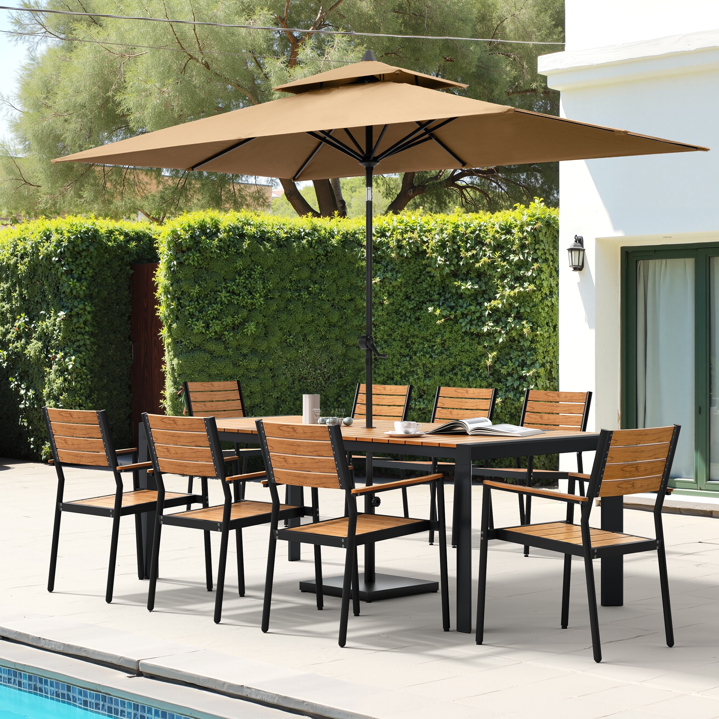 Set of 11 Outdoor Patio Dining Set WoodLike Aluminum Umbrella Hole Table with Stackable Armchairs, Market Umbrella Set