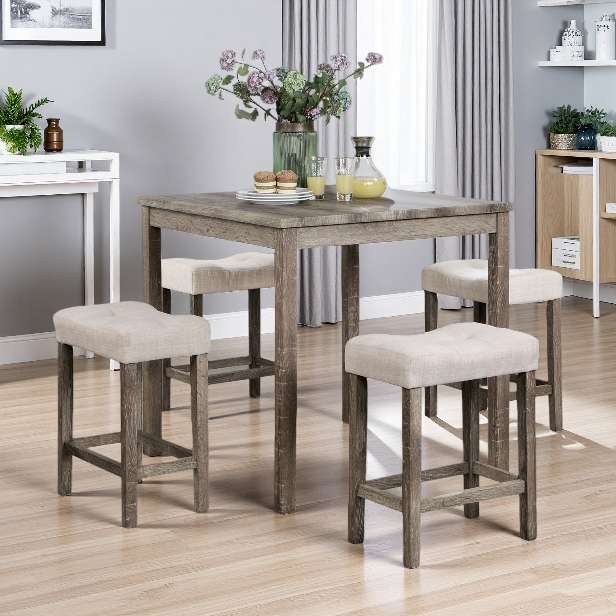 Set of 5 Square 36" Counter Height Dining Table with 4 Linen-like Saddle Seat Stools Transitional Dining Set with Button Tufting