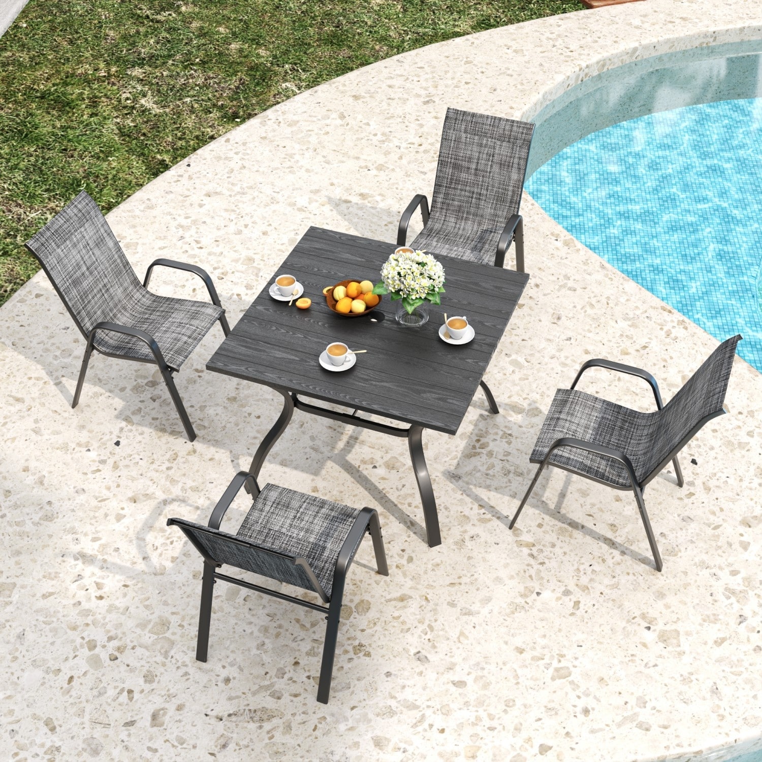 5-Piece Patio Set, Wood Grain Metal Table and 4 Textilene Fabric Chairs