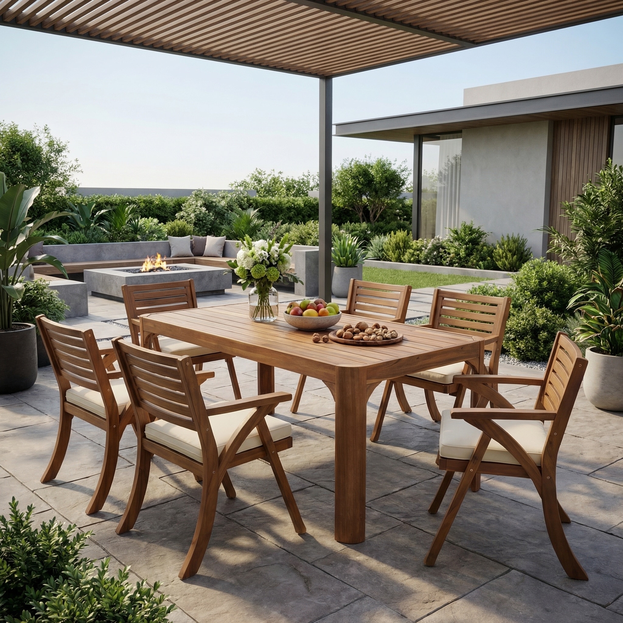 Christopher Knight Home - Outdoor Solid Acacia Wood 7-Piece Dining Table Set with Slatted Rectangle Table and Cushioned Chairs