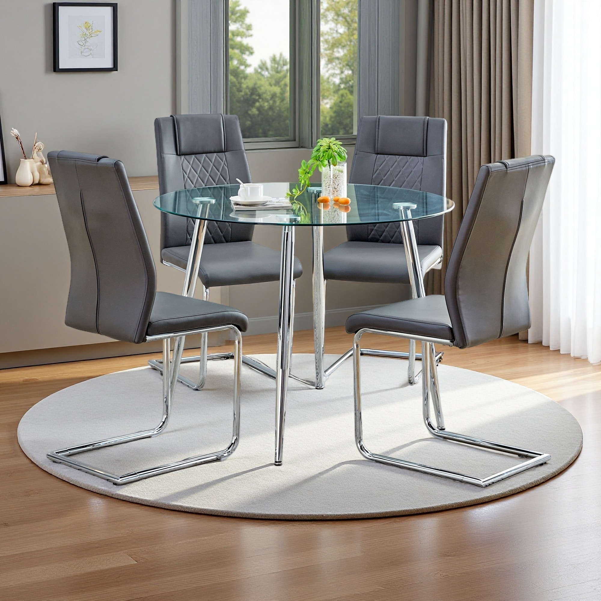 38.6" Transparent Tempered Glass Round Dining Set with 4 PU Chairs