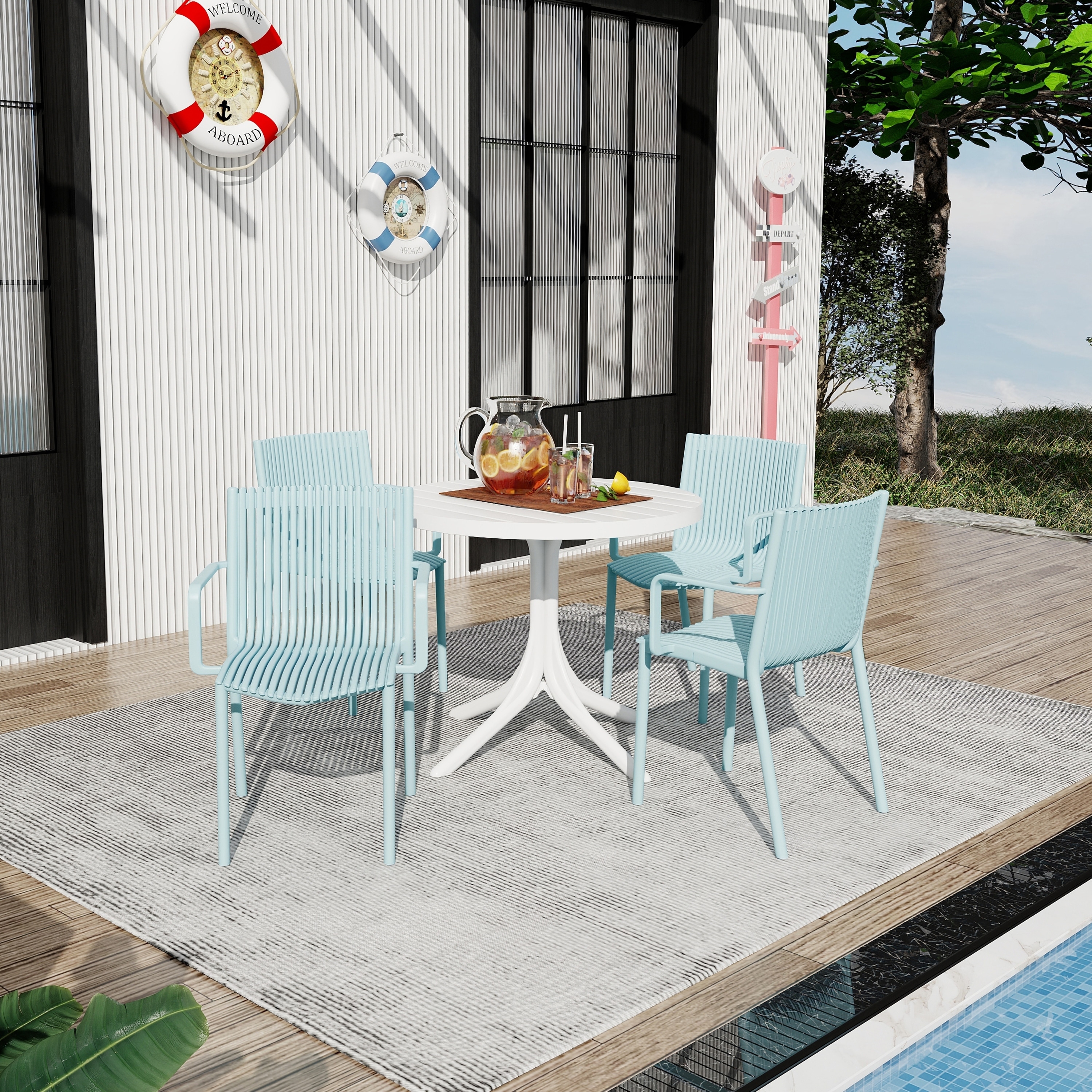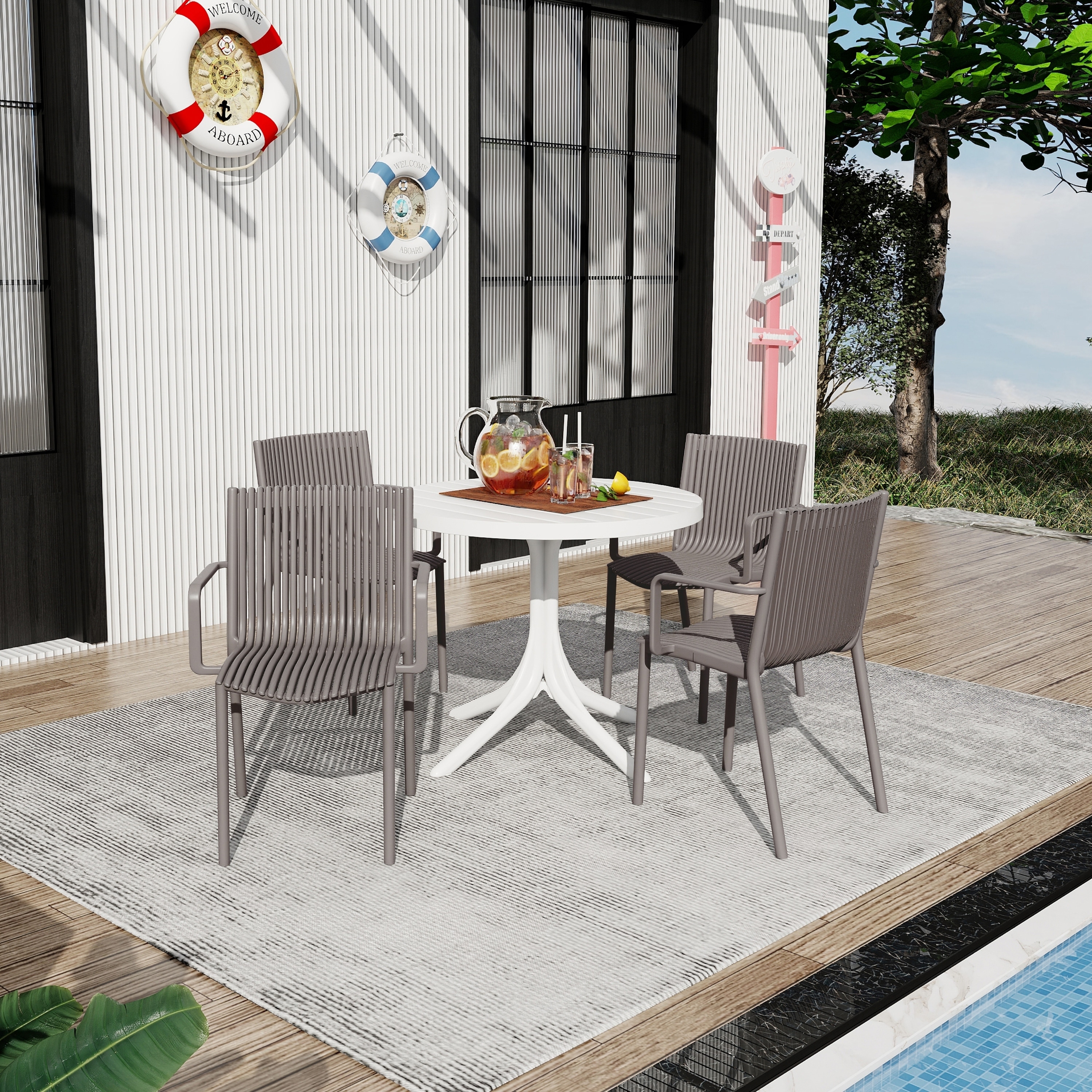 4pcs Warm Stackable PP Armchair Ergonomic Slatted Back with 36 Inch Indoor/Outdoor Modern Round PP Table