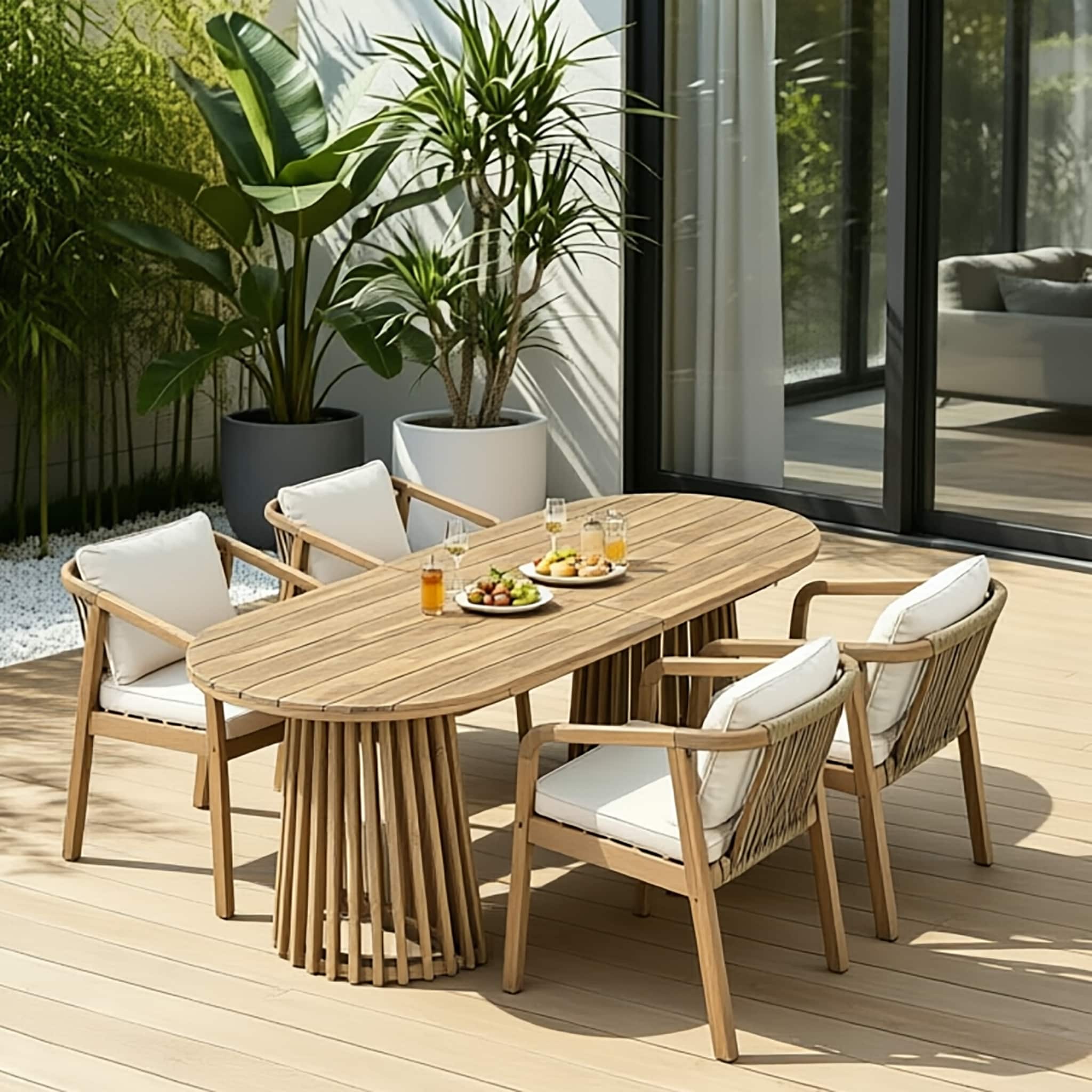 Christopher Knight Home - Modern Outdoor Acacia Wood Pedestal Dining Set with 83" Oval Racetrack Table & Rope Cushion Armchair