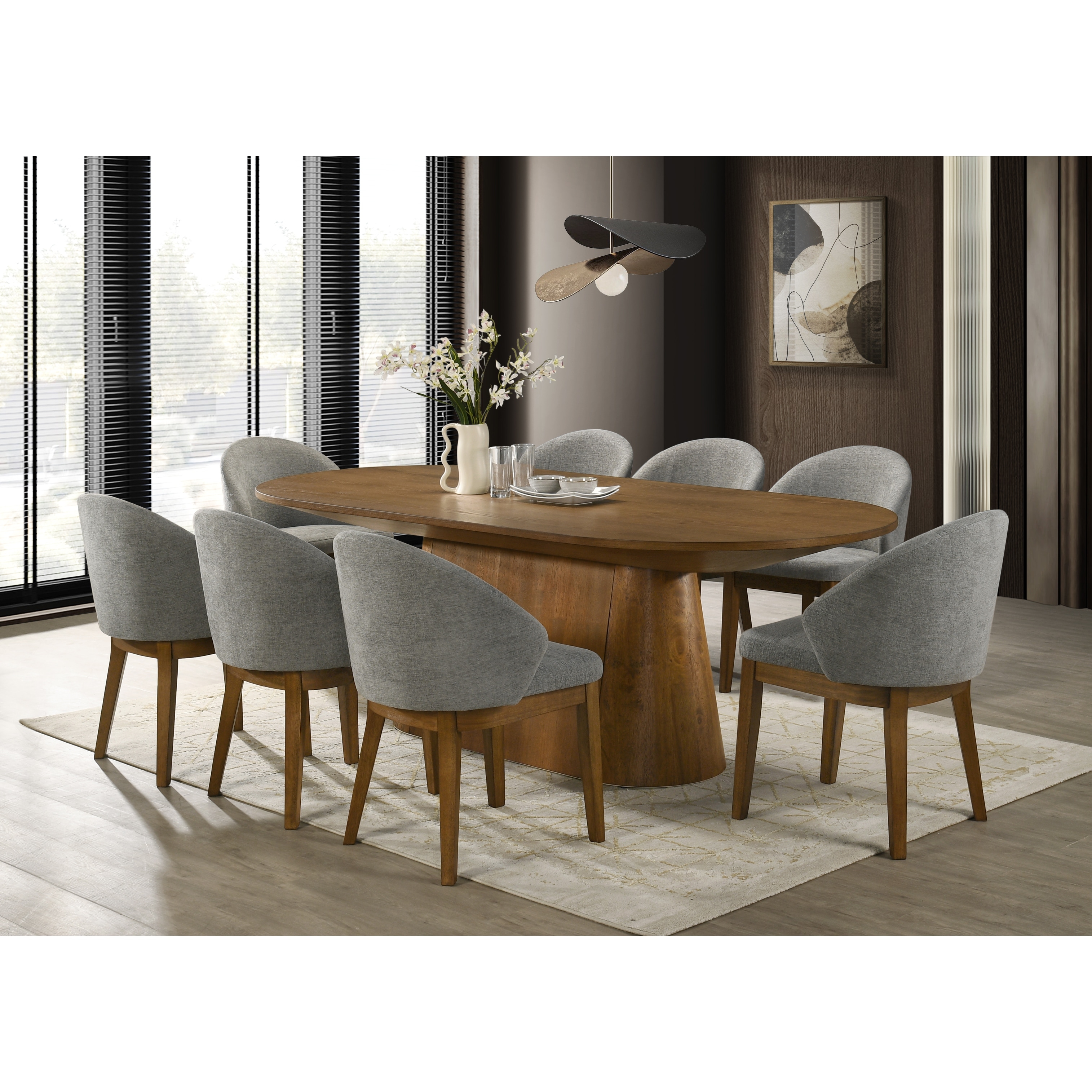 Andrew 9-Piece Oval Dining Set, 88-inch Walnut Finish Pedestal Table with 8 Light Gray Fabric Upholstered Chairs, Seats 8