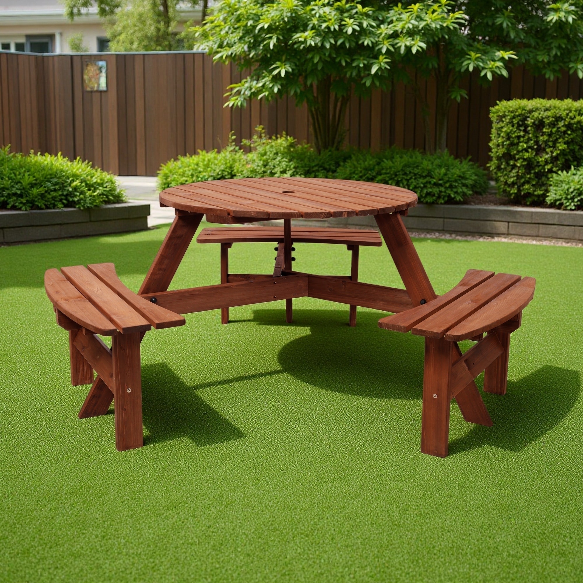 6-Person Outdoor Patio Fir Wood Picnic Table Set with 3 Built-in Benches and Umbrella Hole