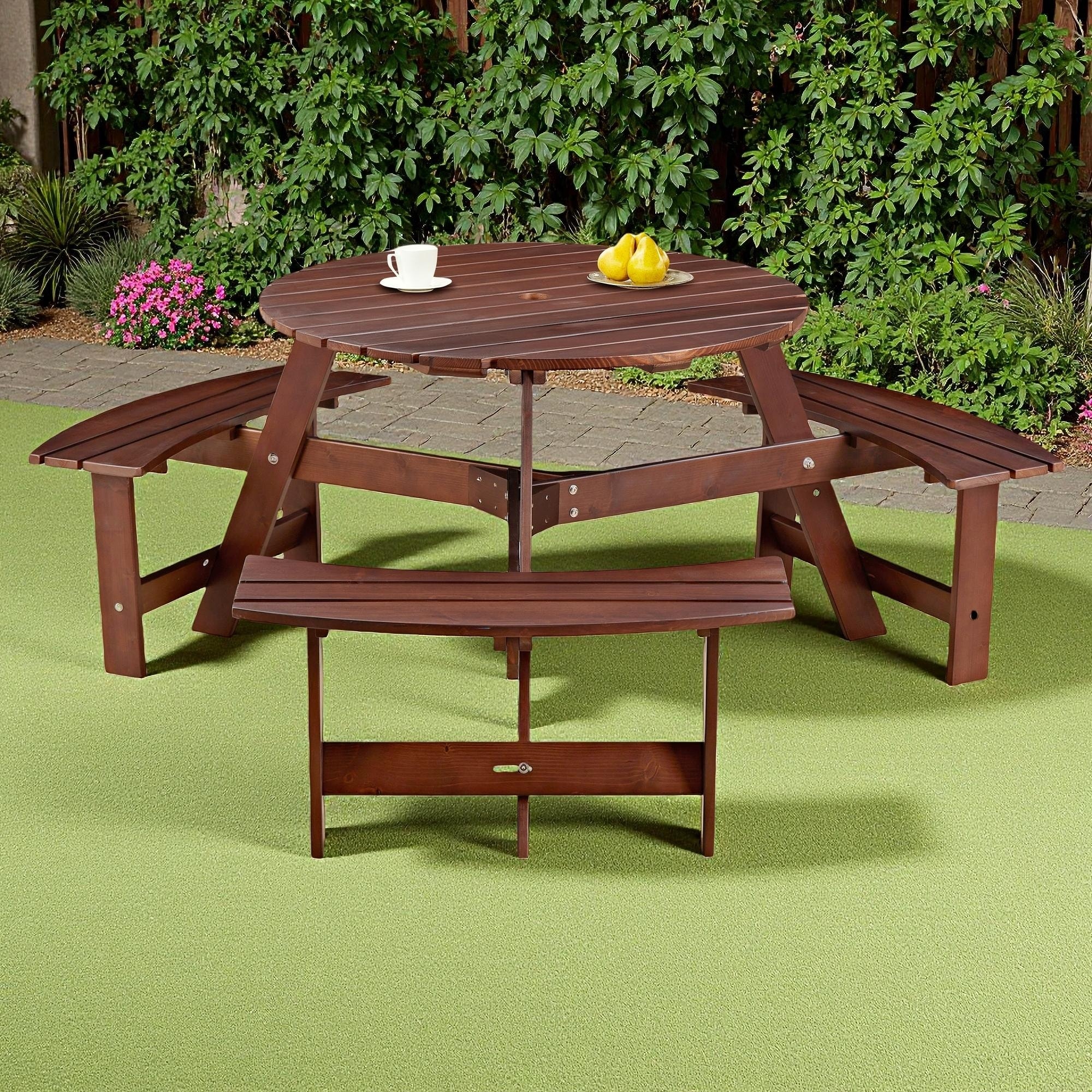 6-Person Outdoor Patio Wooden Round Picnic Table with 3 Built-in Benches and Umbrella Hole