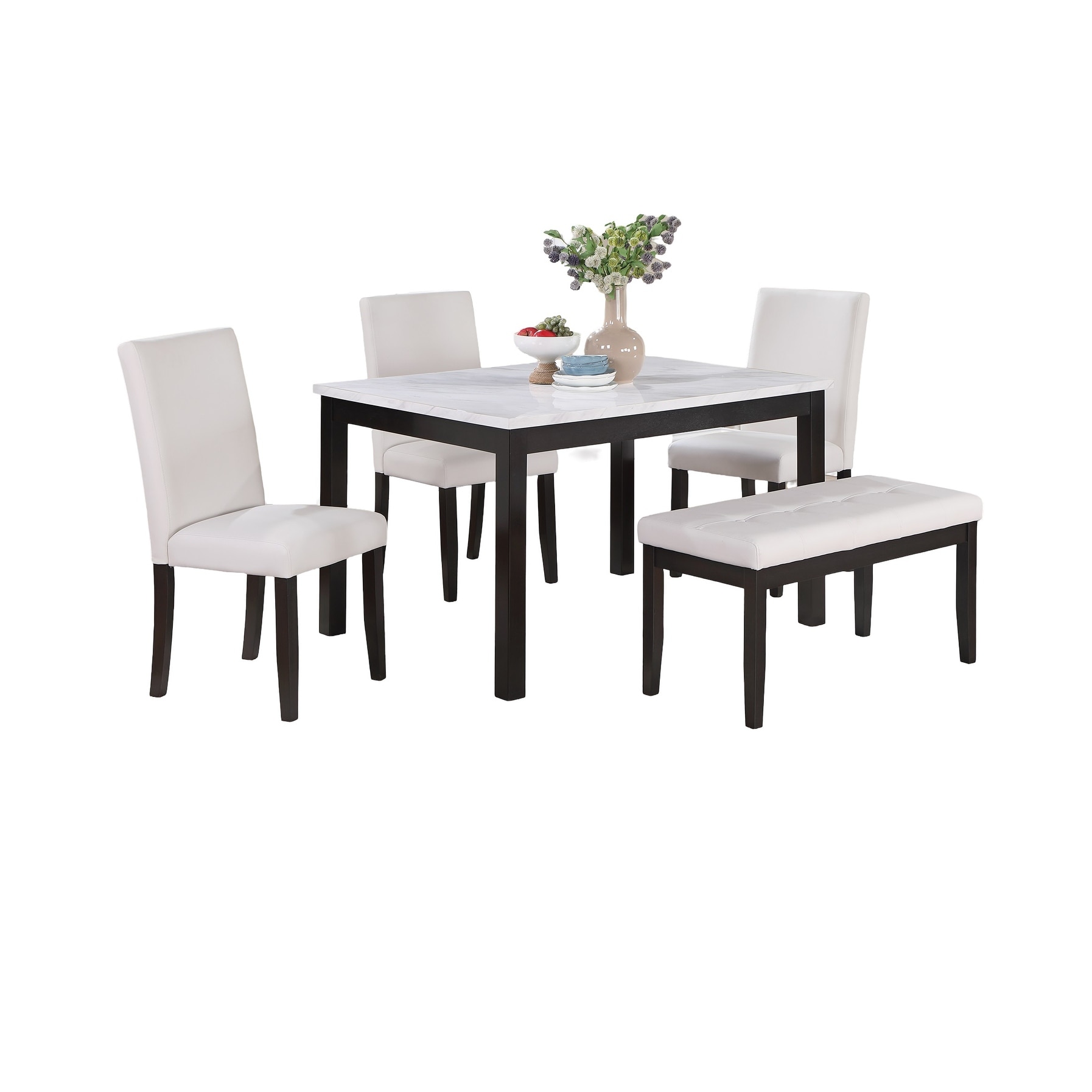 Classic Stylish 5pc Dining Set Kitchen Dinette Faux Marble Top Table Bench and 3x Chairs White Faux Leather Cushions Sea
