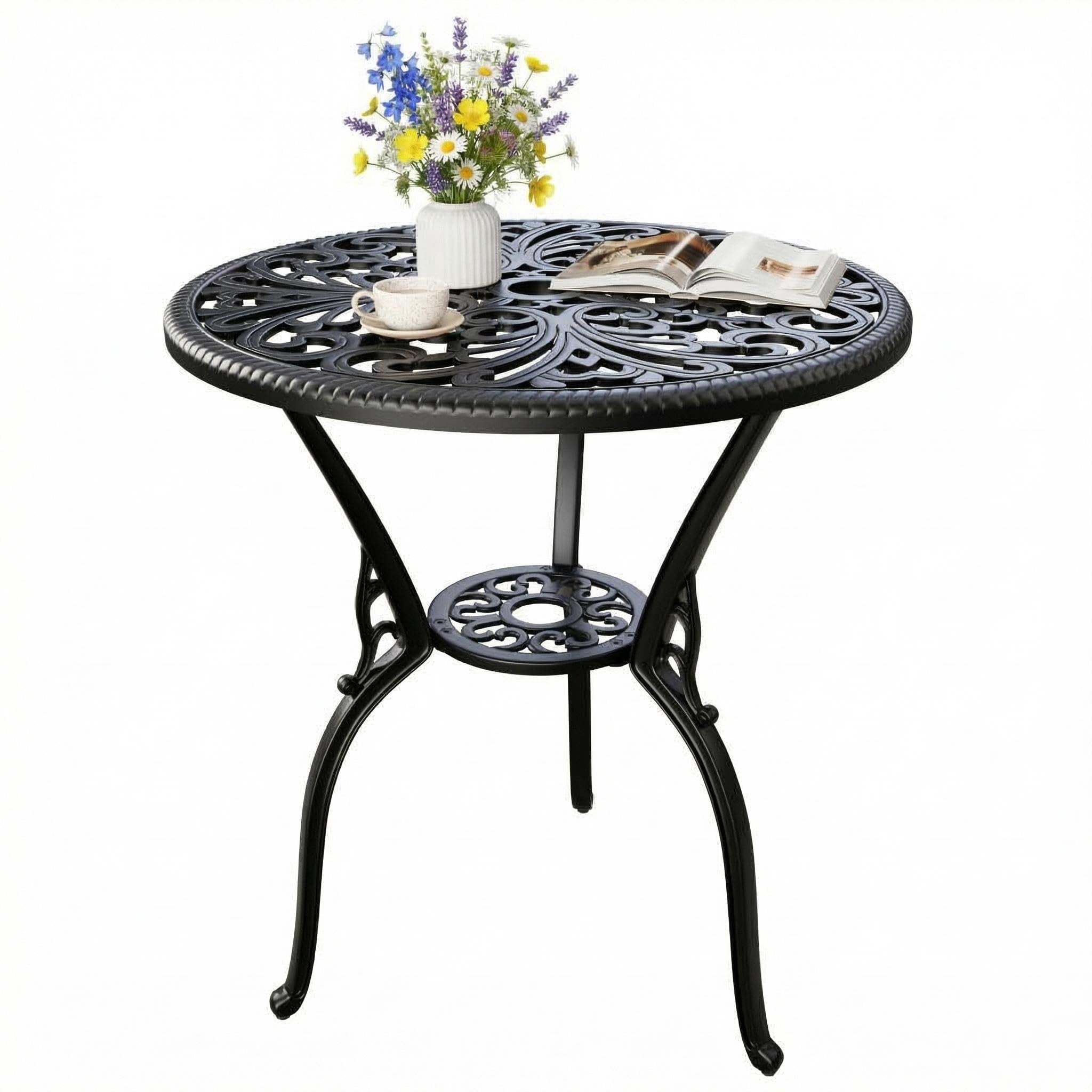 23" Round Cast Aluminum Patio Bistro Table, Outdoor Coffee Bistro Side Table with Umbrella Hole, Antique Design Dining Desk