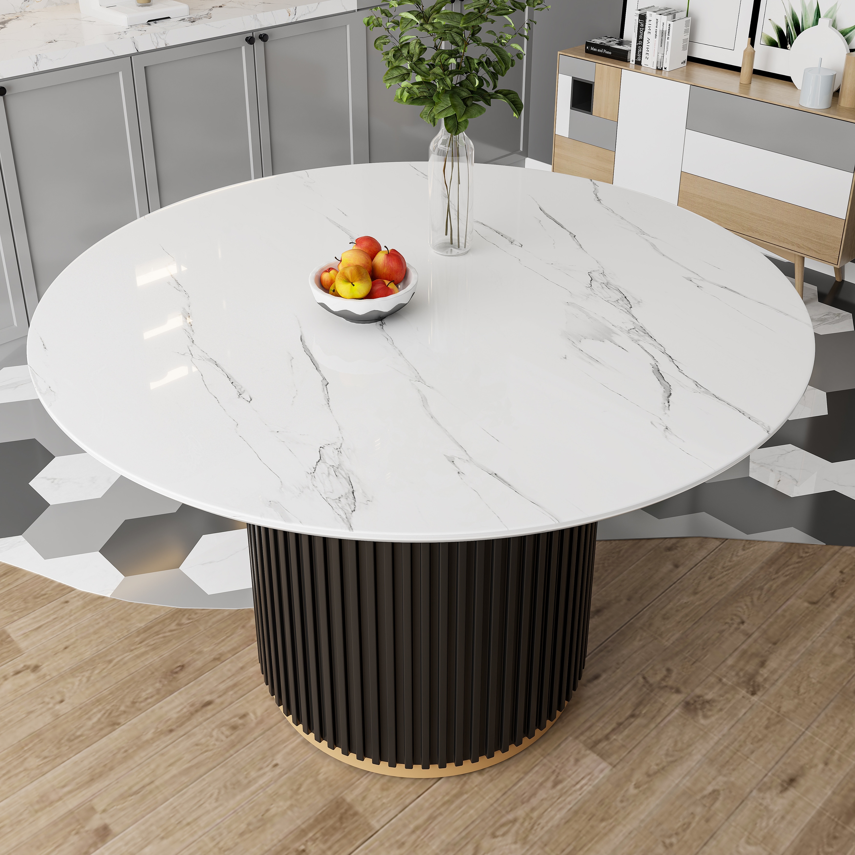 Round Faux Marble Dining Table with Fluted Base and Accents