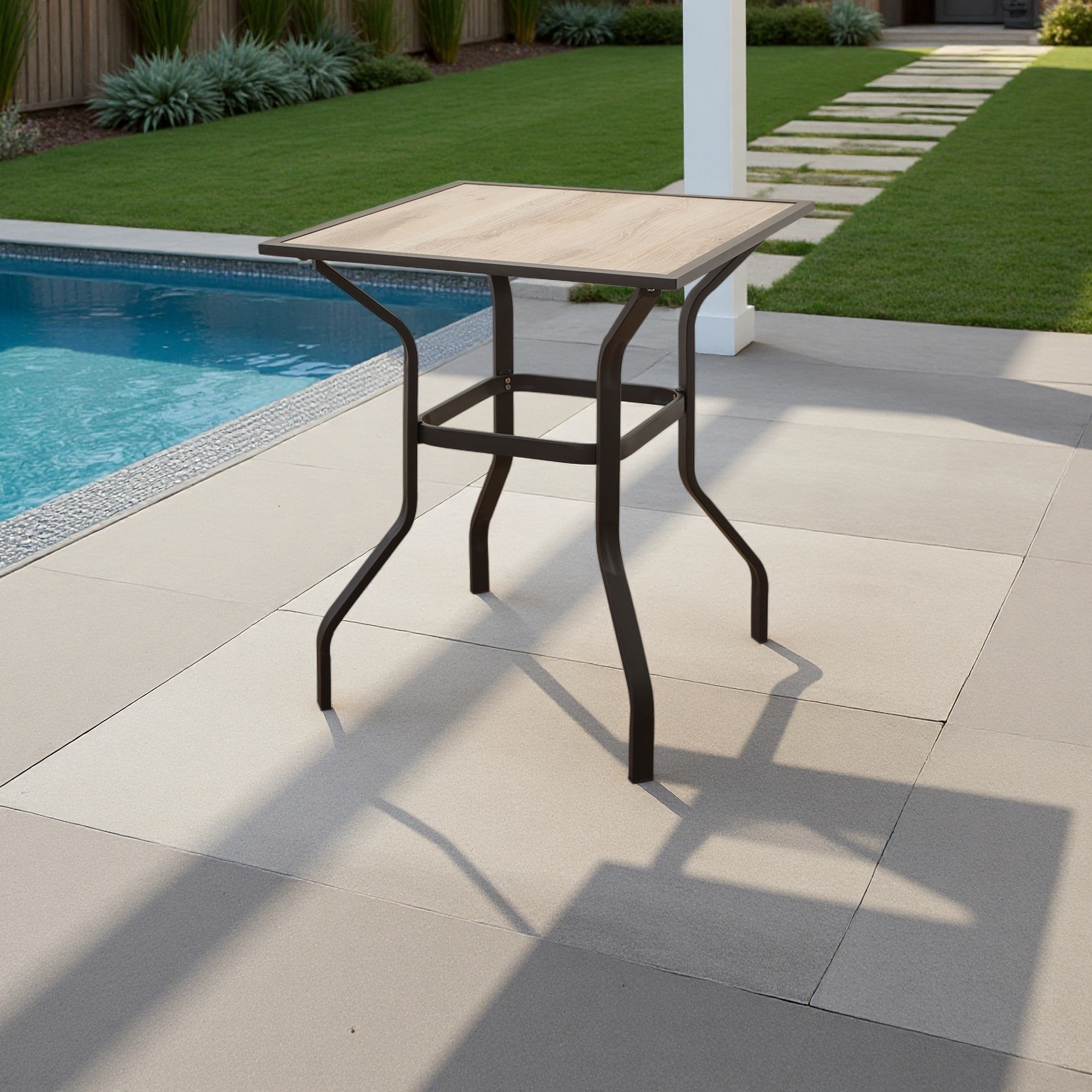 Outdoor Square Bar Table with Wood-Look Tabletop and Sturdy Metal Frame