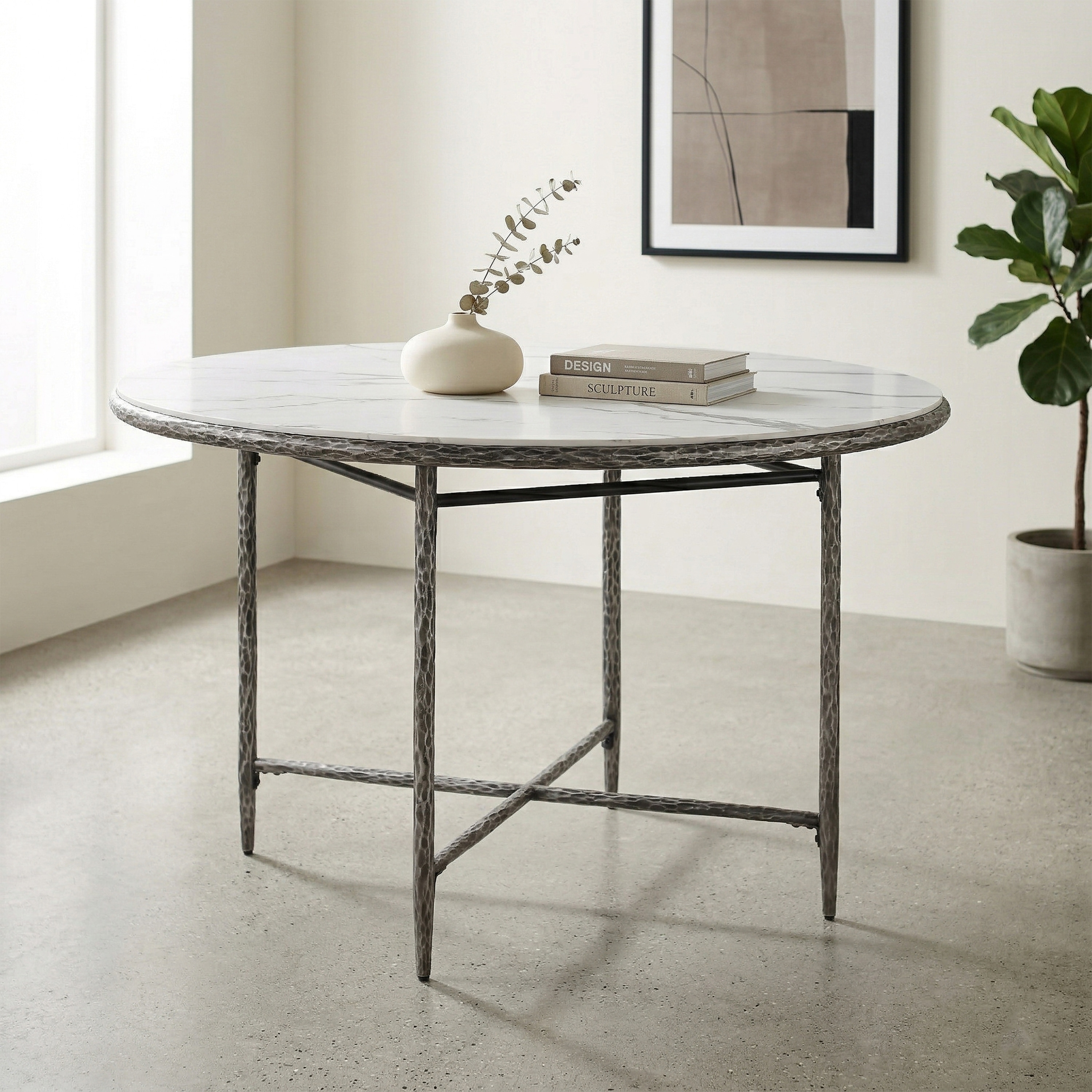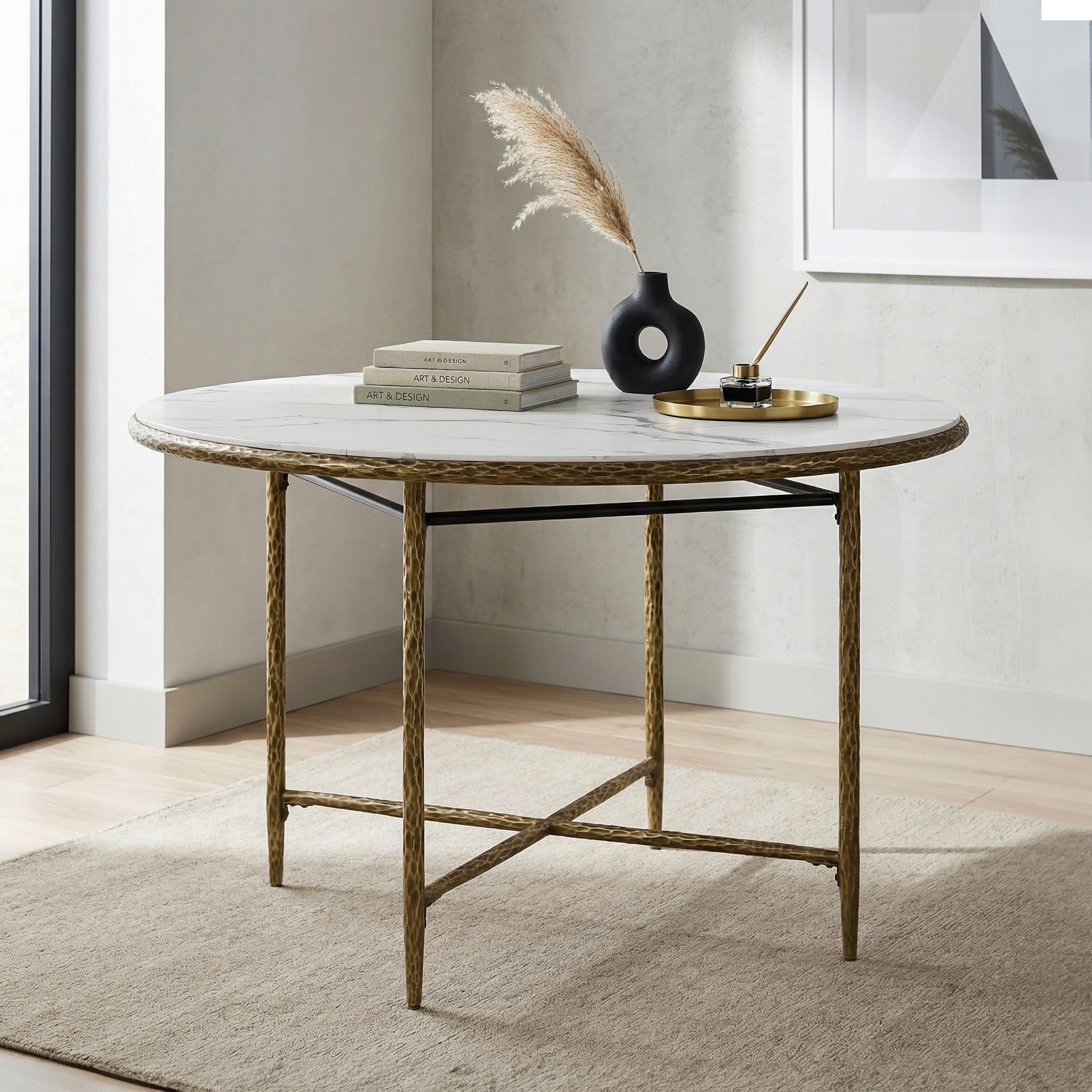 247 Shop At Home Lalia Modern Hammered Metal X-Brace Round Dining Table with Faux Marble Top