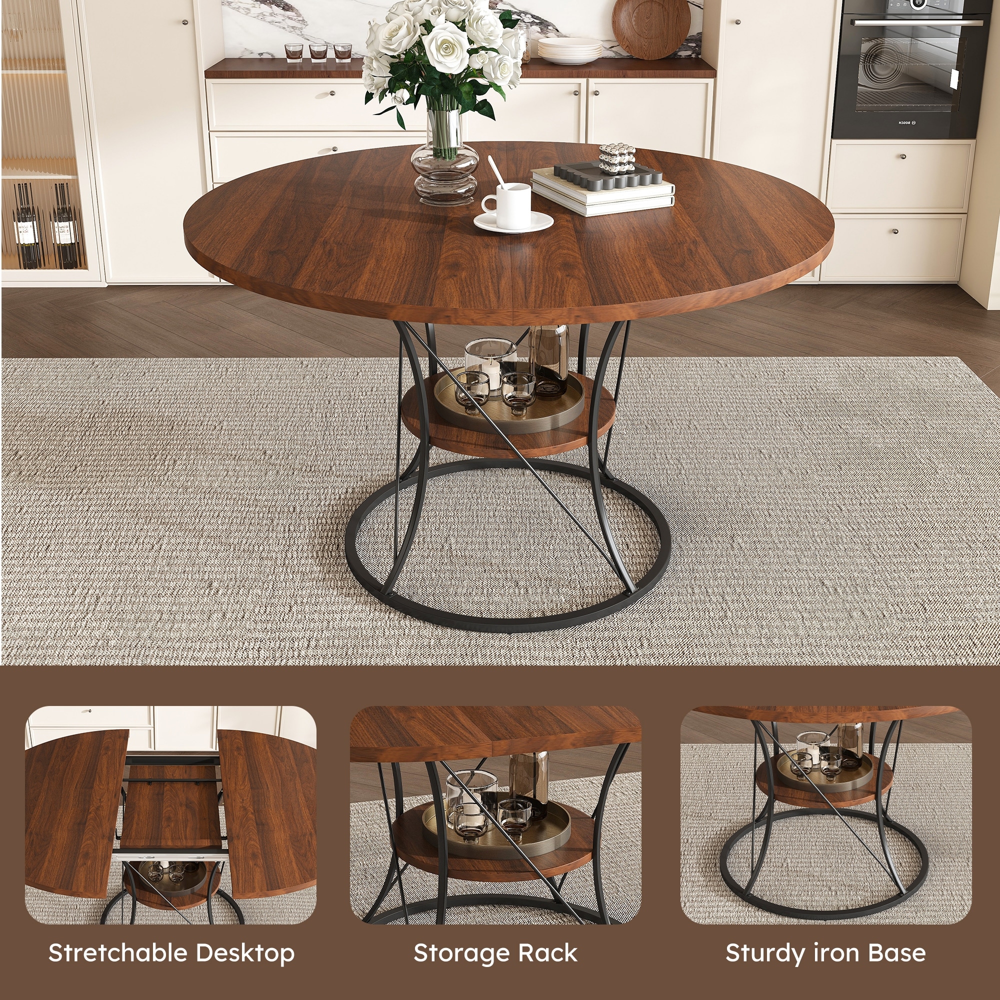 43 inch Round Extendable Dining Table for 4-6 (Not Including Chair)
