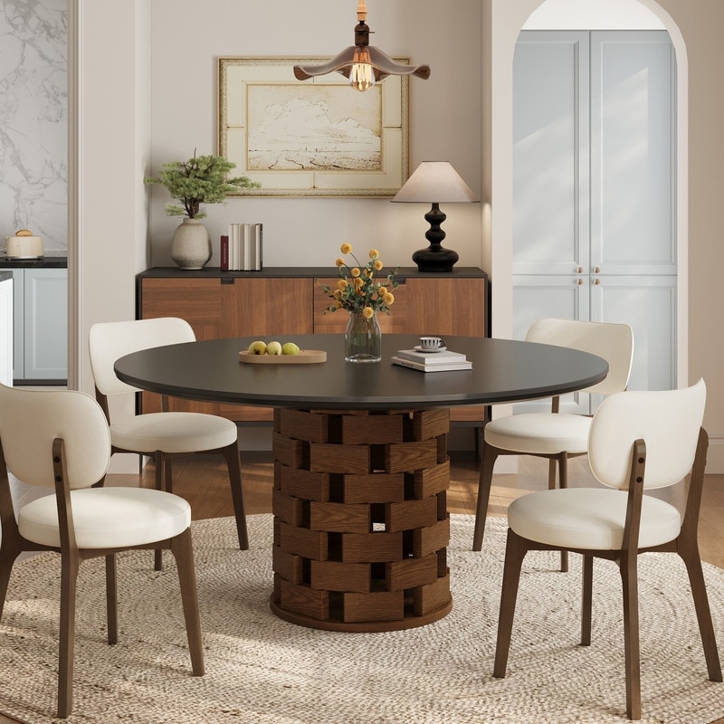 51" Mid-century Modern Round Dining Table, Black Sintered Stone Top, Sculptural Wooden Base, Retro Kitchen Table For 4-6 People