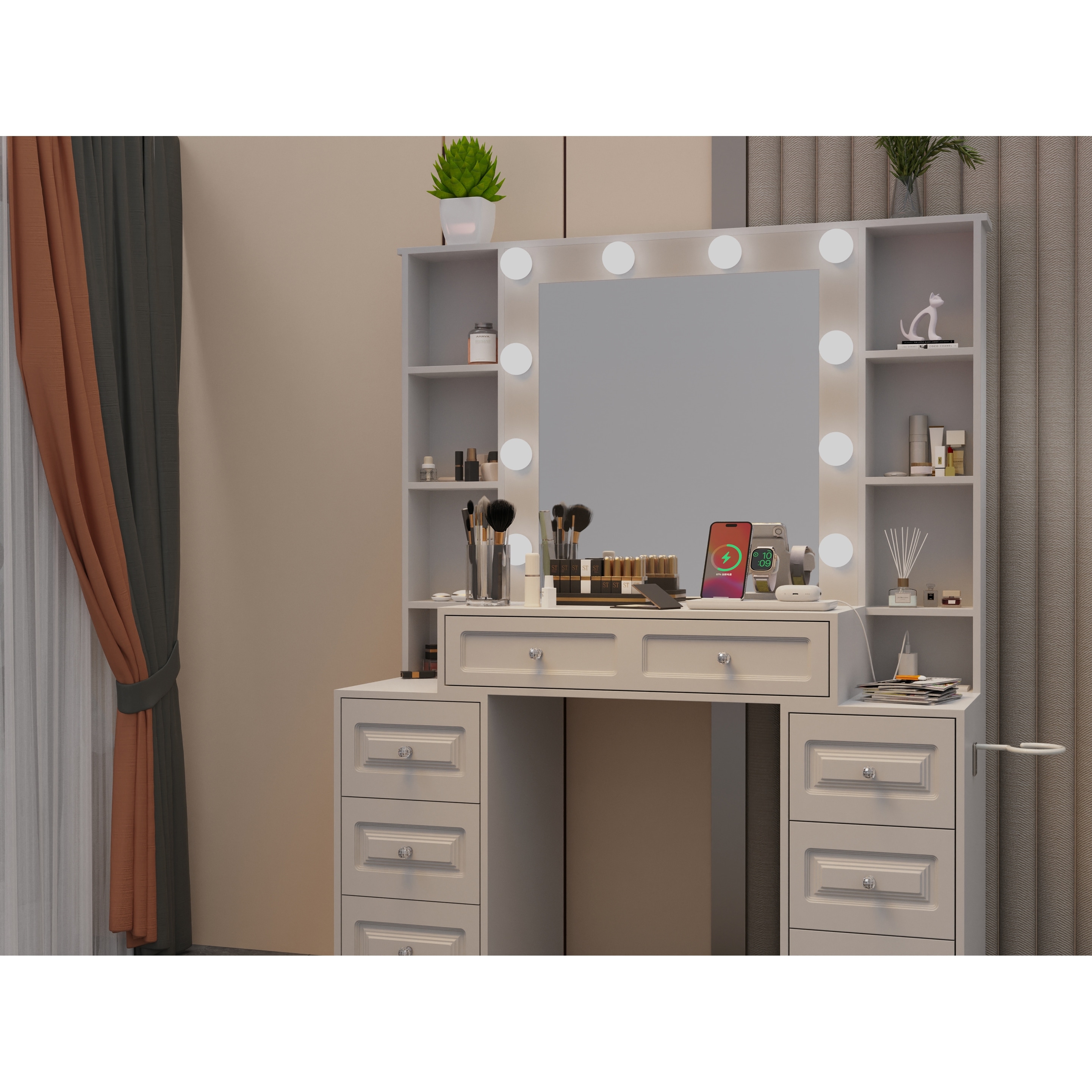 Vanity Desk with with Lighted Mirror, Large Makeup Vanity Desk, Dresser Table with Charging Station, Drawers & Hair Dryer Stand